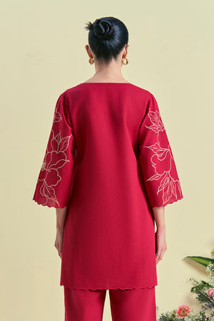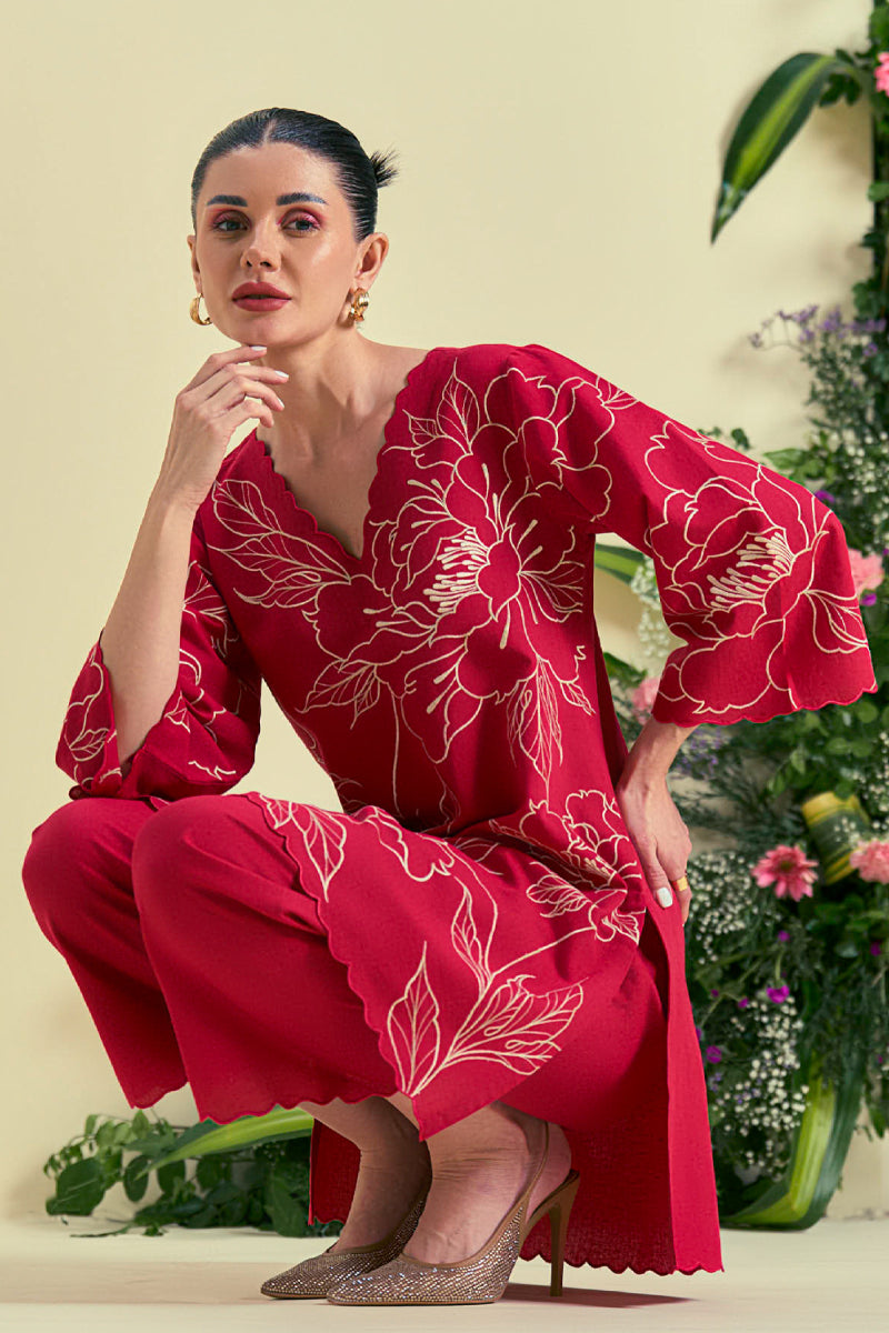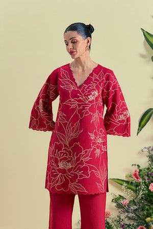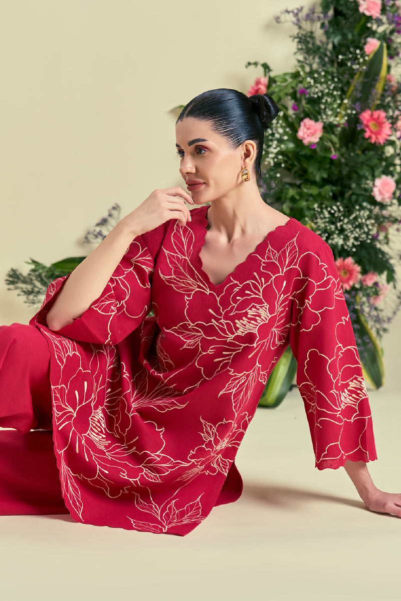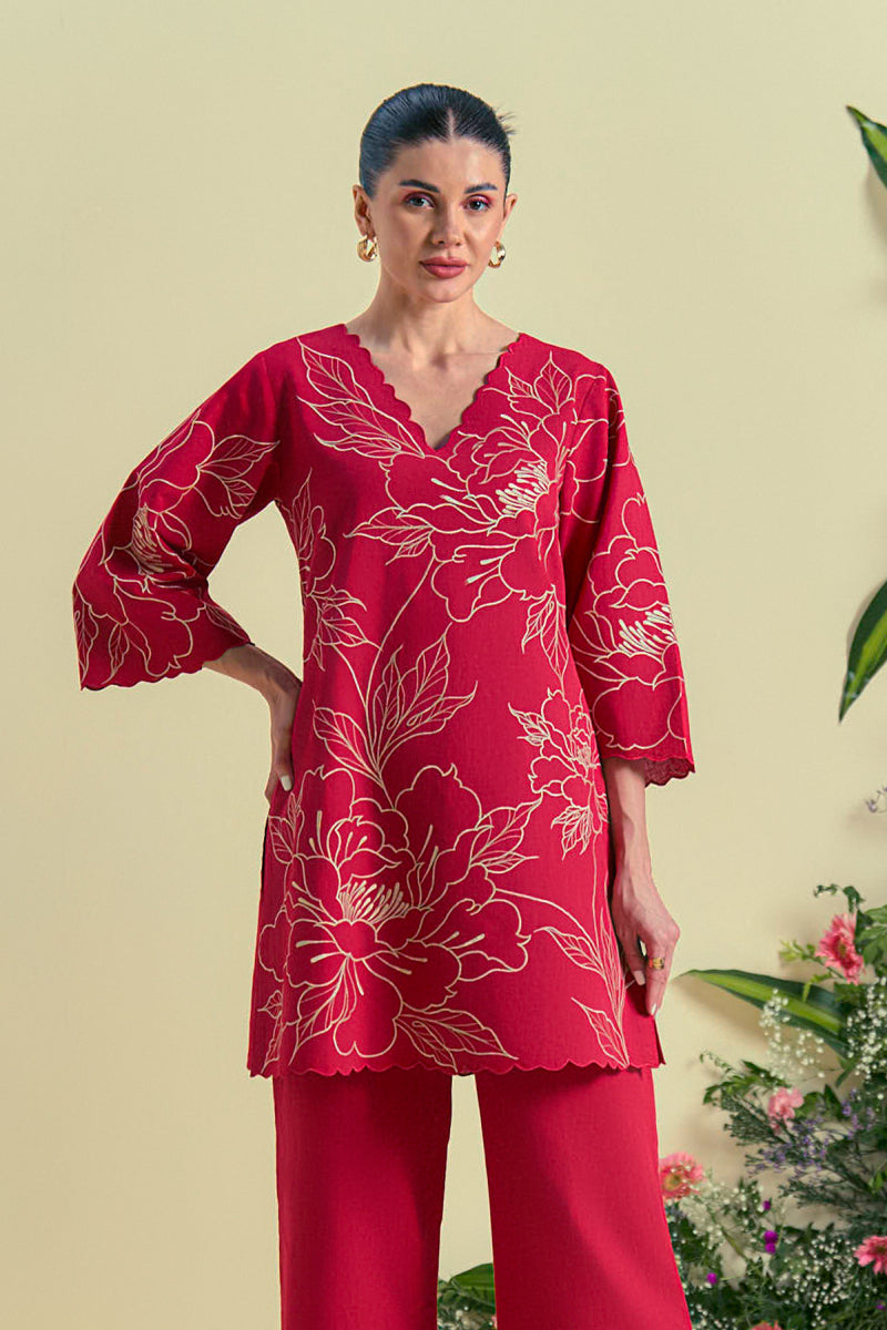 The tunic features mesmerizing overall floral embroidery paired with delicate scalloping along the V-neck, hemline, and sleeves, creating an effortlessly refined look. This tunic is designed to make you feel confident, graceful, and truly special.