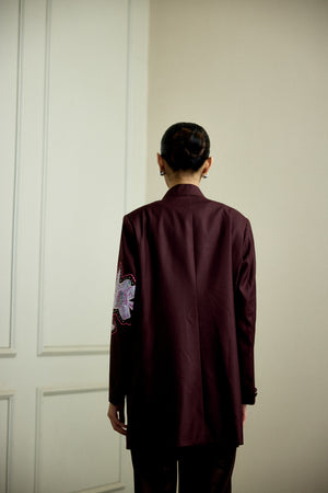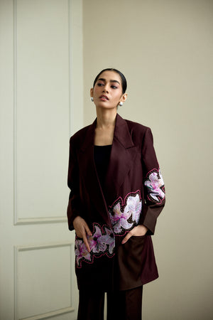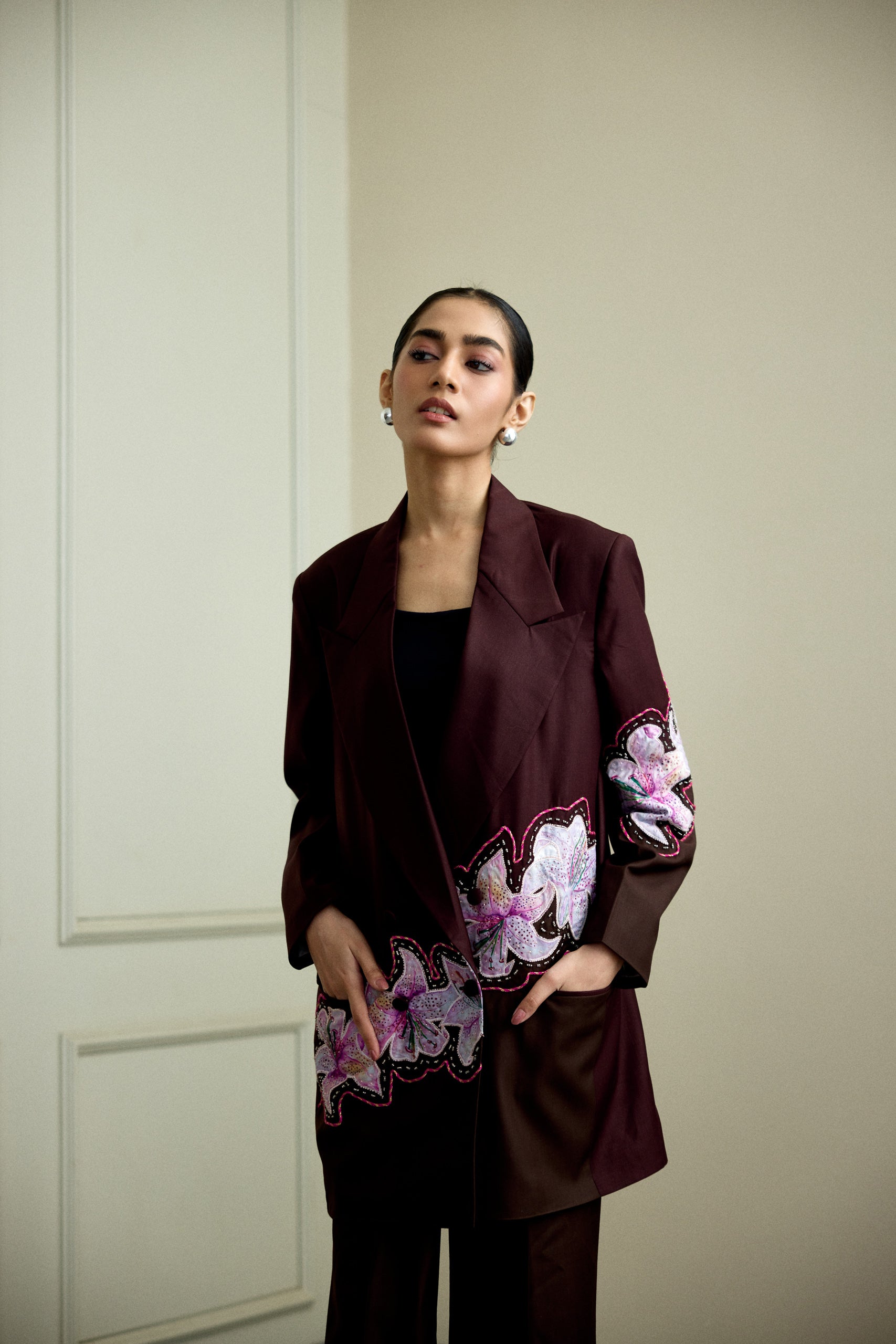Elevate your wardrobe with the Orya Blazer Set, featuring a rich brown blazer adorned with exquisite floral Lily hand embroidery and delicate painted details. This sophisticated ensemble combines timeless elegance with artisanal craftsmanship, perfect for making a confident statement at any occasion.