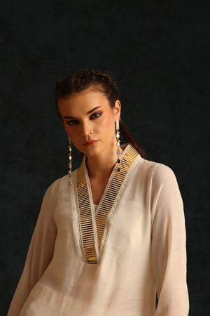 Overlap collar tunic embellished with foil lace paired with a palazzo pant
