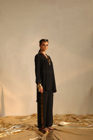 Overlap collar tunic embellished with foil lace paired with a palazzo pant