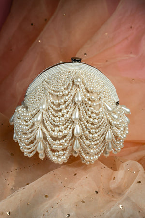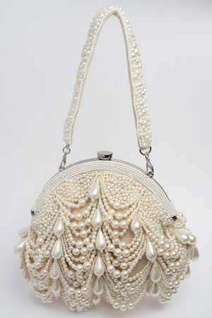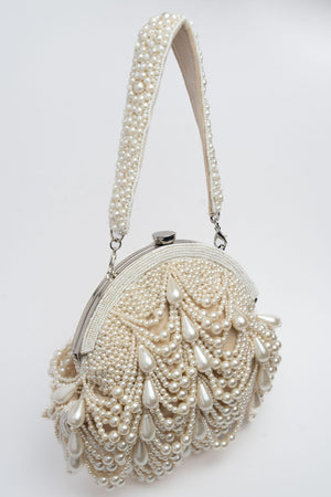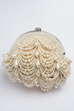Cream based, pearl scalloped framed clutch with a pearly beaded handle to bring in the perfect look anytime of the day.