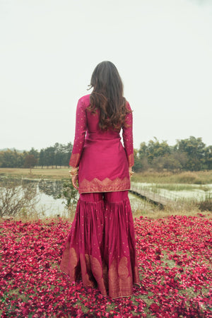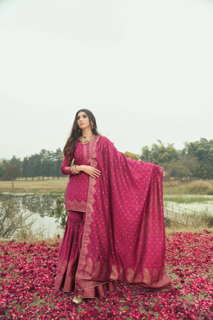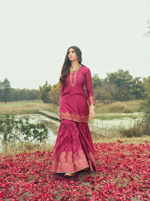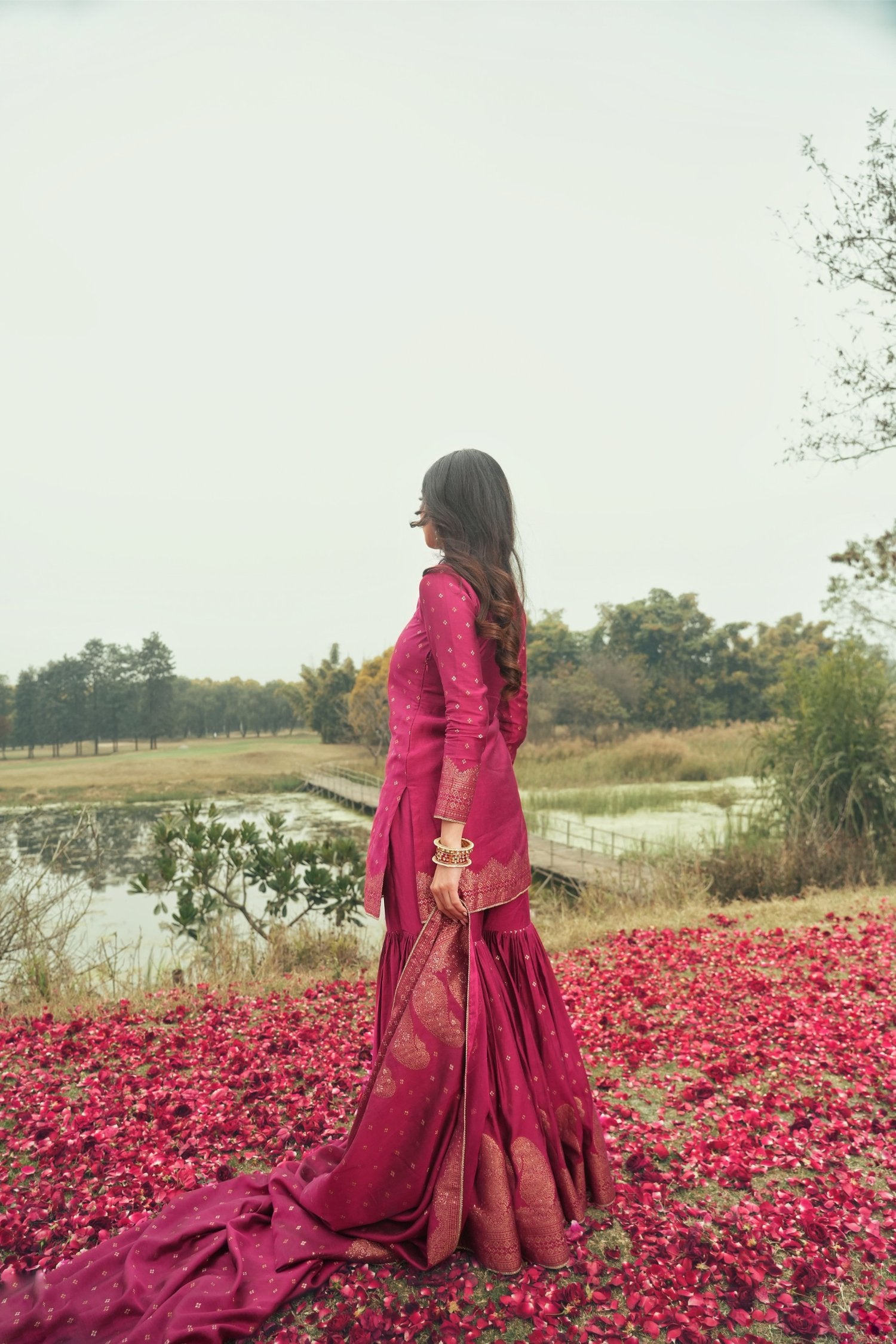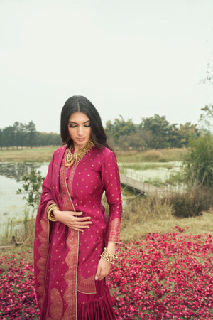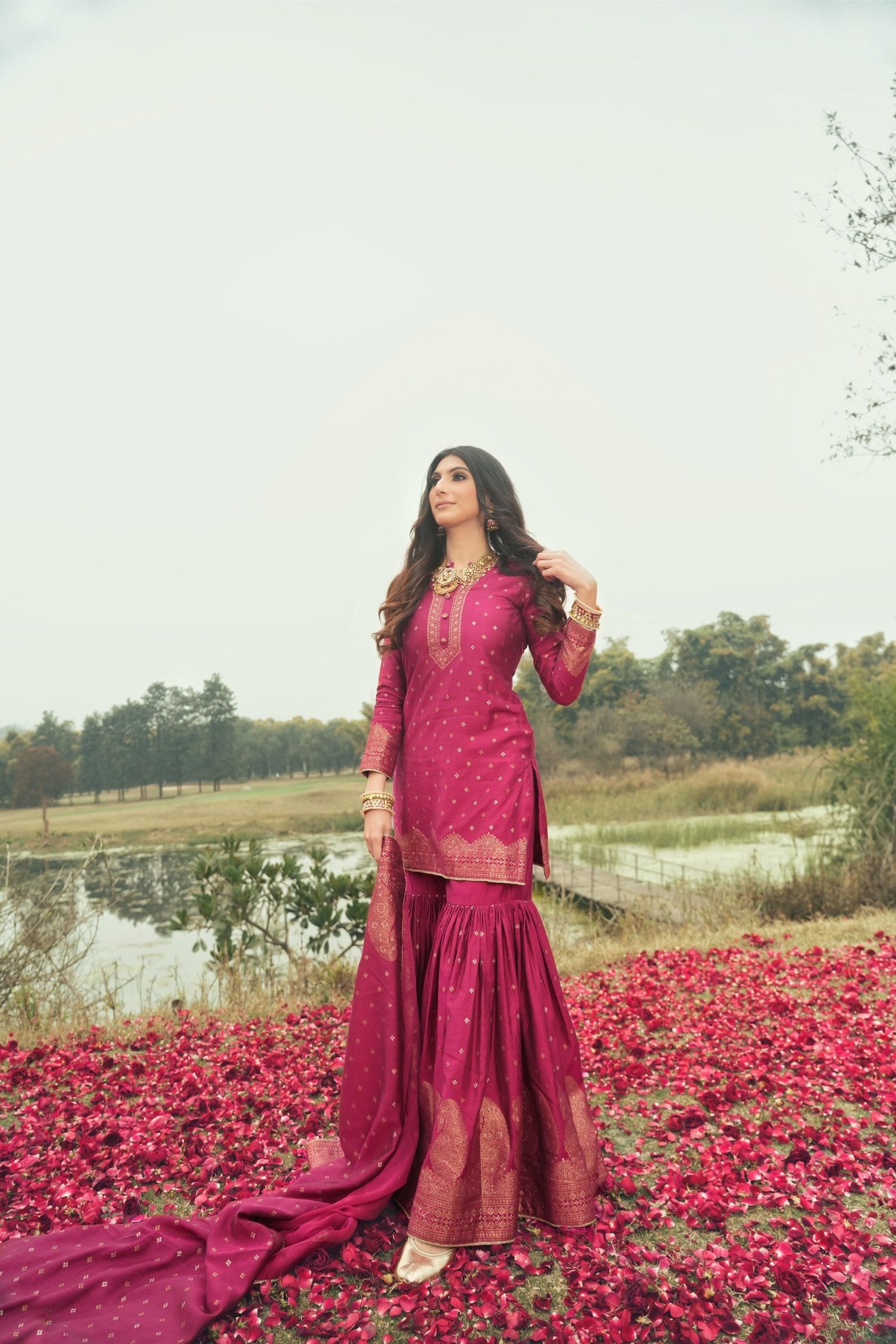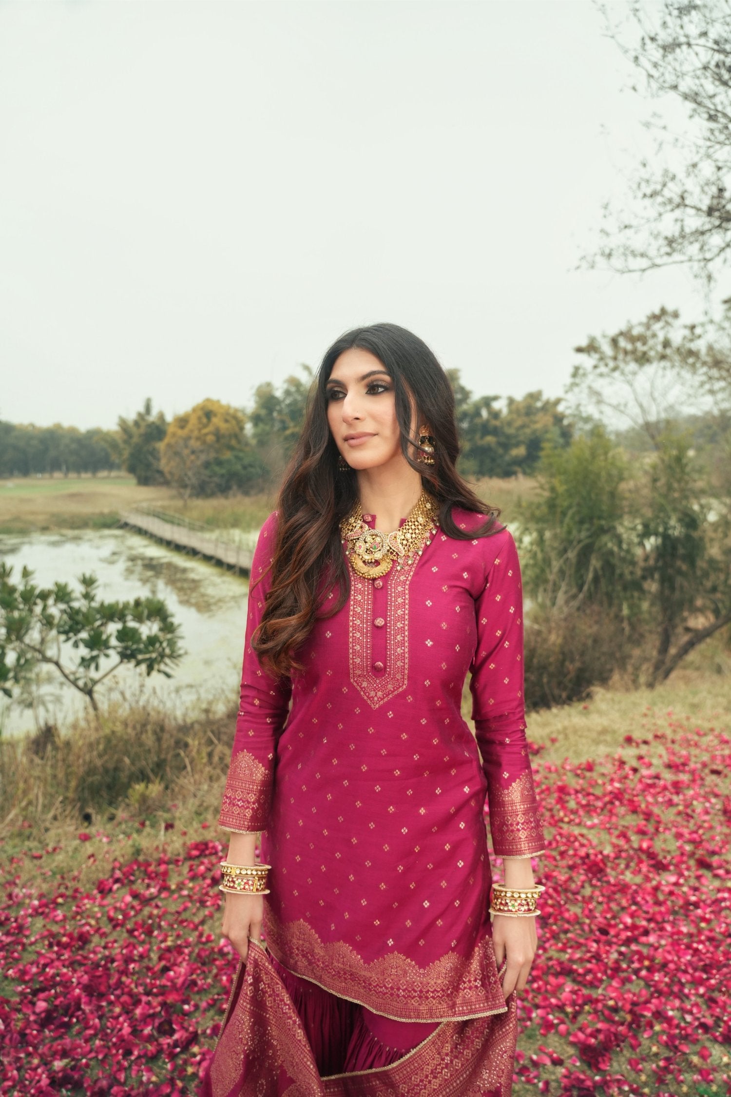 Introducing the Azeela Sharara, a captivating embodiment of cultural heritage and contemporary elegance. Crafted from luxurious vegan silk in a mesmerizing magenta hue, this woven Sharara ensemble features intricate paisley motifs that exude timeless charm and sophistication. The flowing silhouette of the Sharara pants adds a modern twist to the traditional design, making it a perfect choice for weddings, festive occasions, or cultural celebrations.