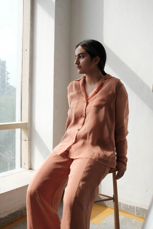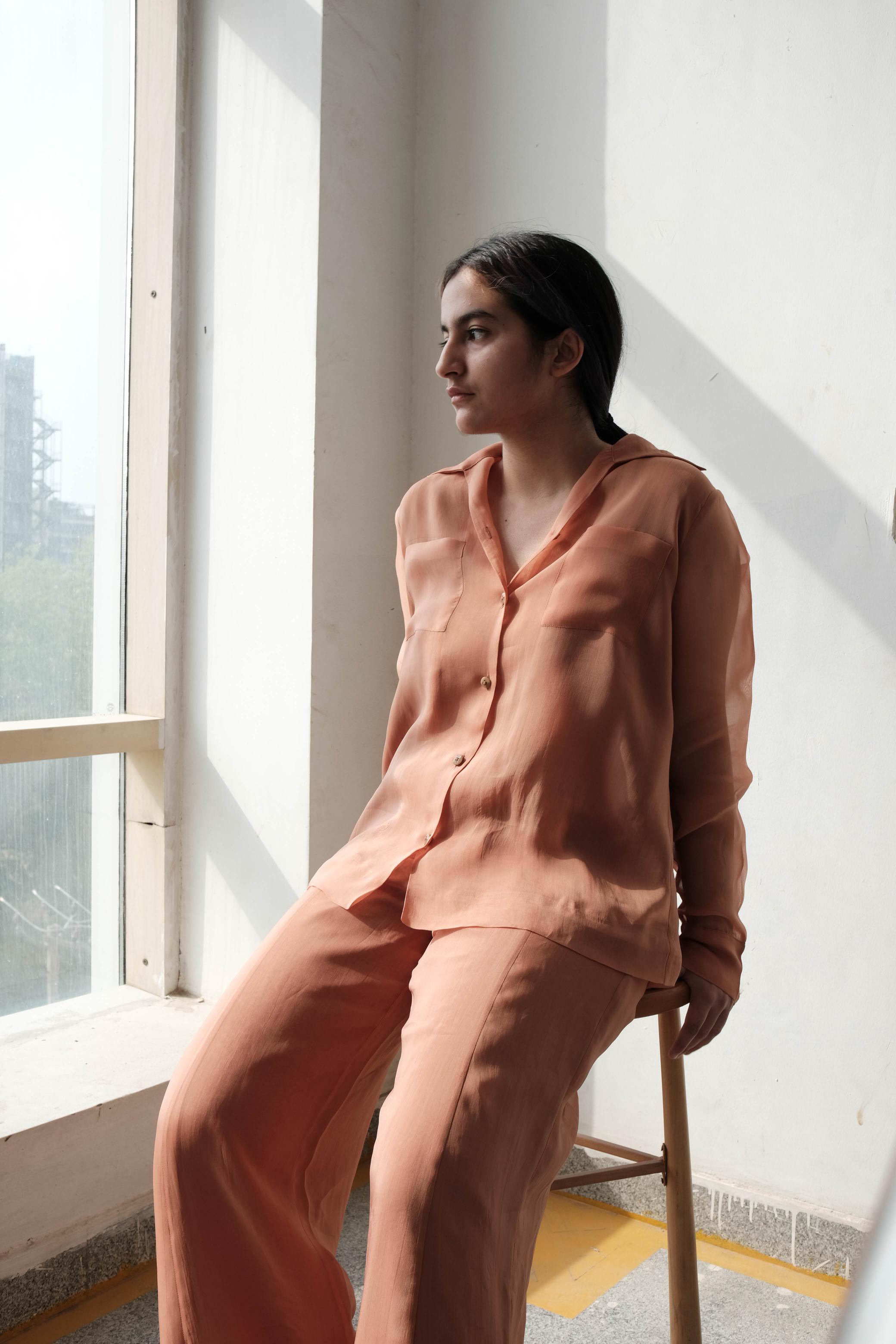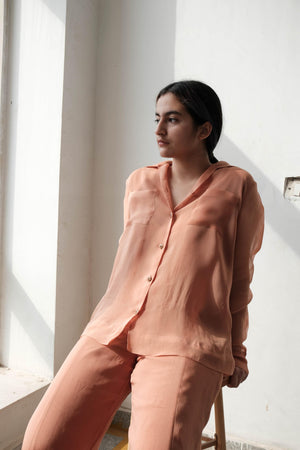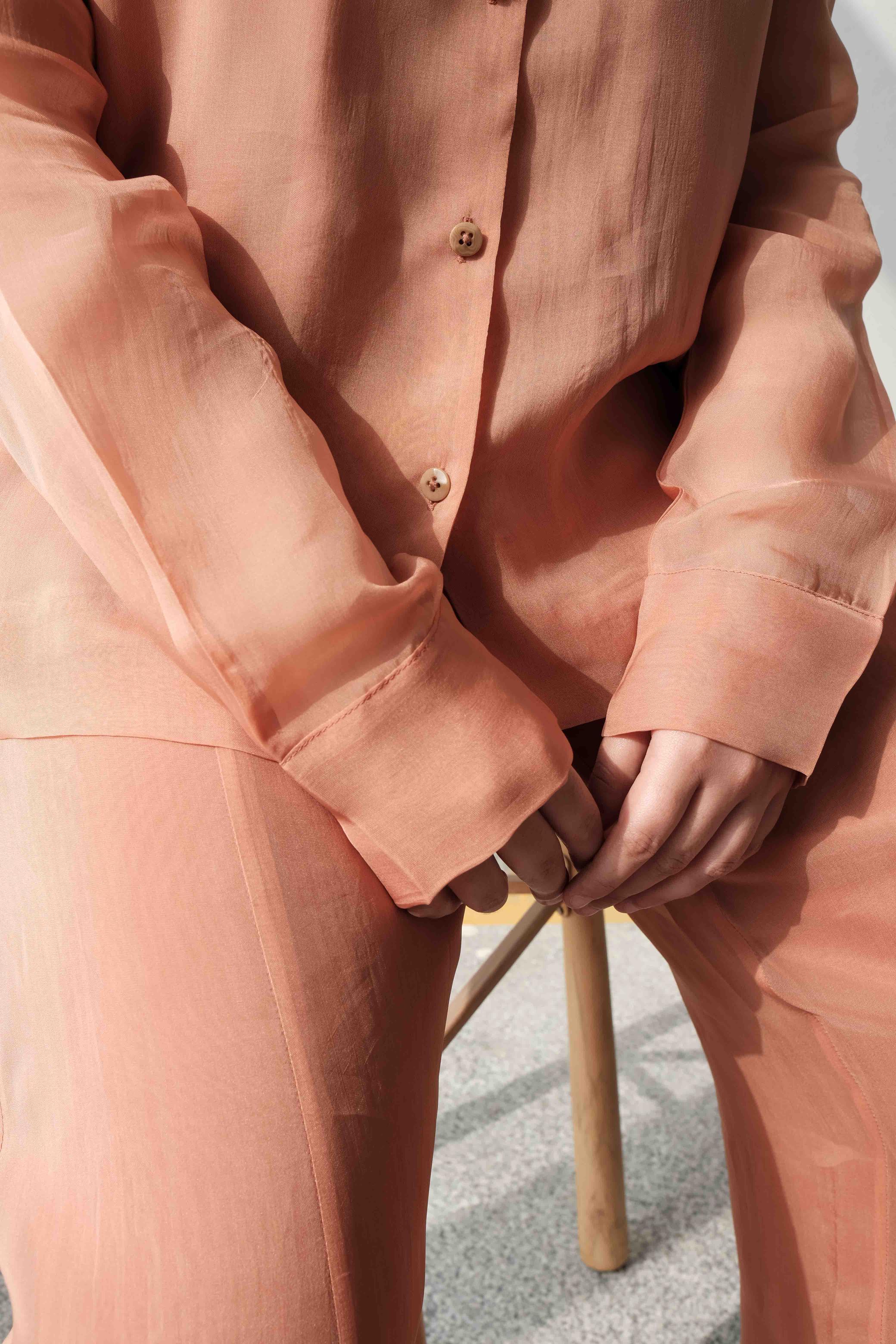 Pale peach sheer shirt with chest pockets ( body lining , no sleeve lining)