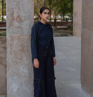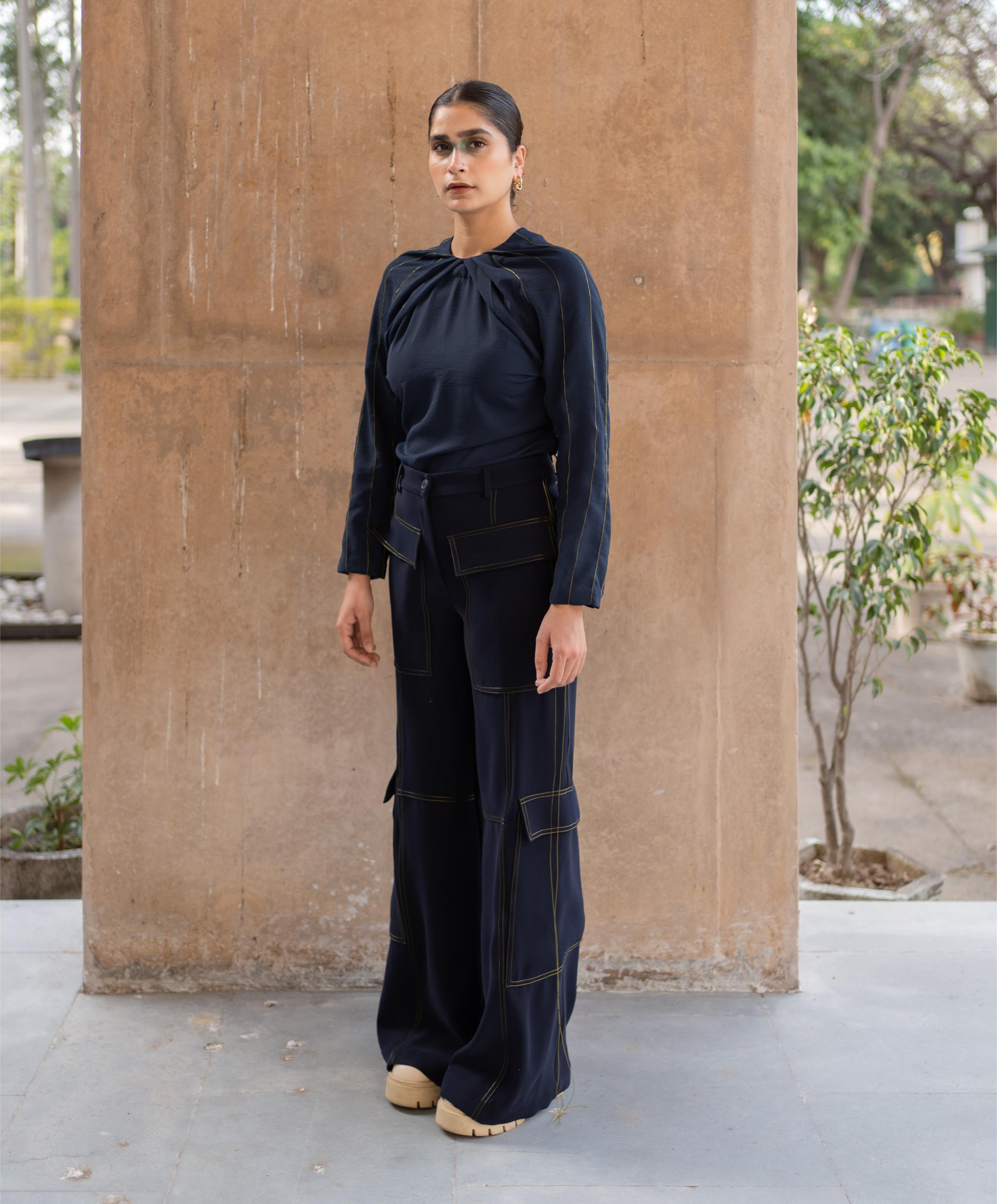raglan sleeve, round/zero neck , back zipper opening, full sleeves pvc line stitch highlights at the sleeve, fitted body,with side zip, falls to the hip