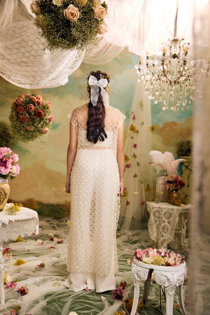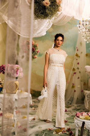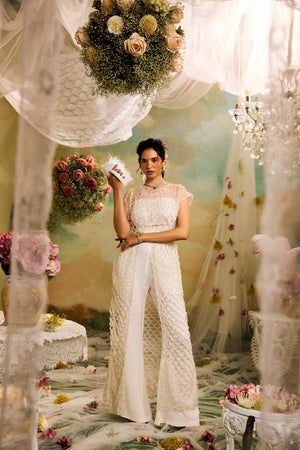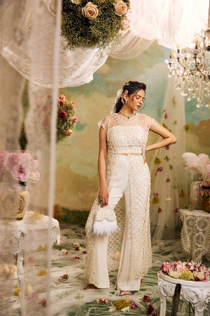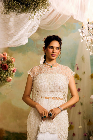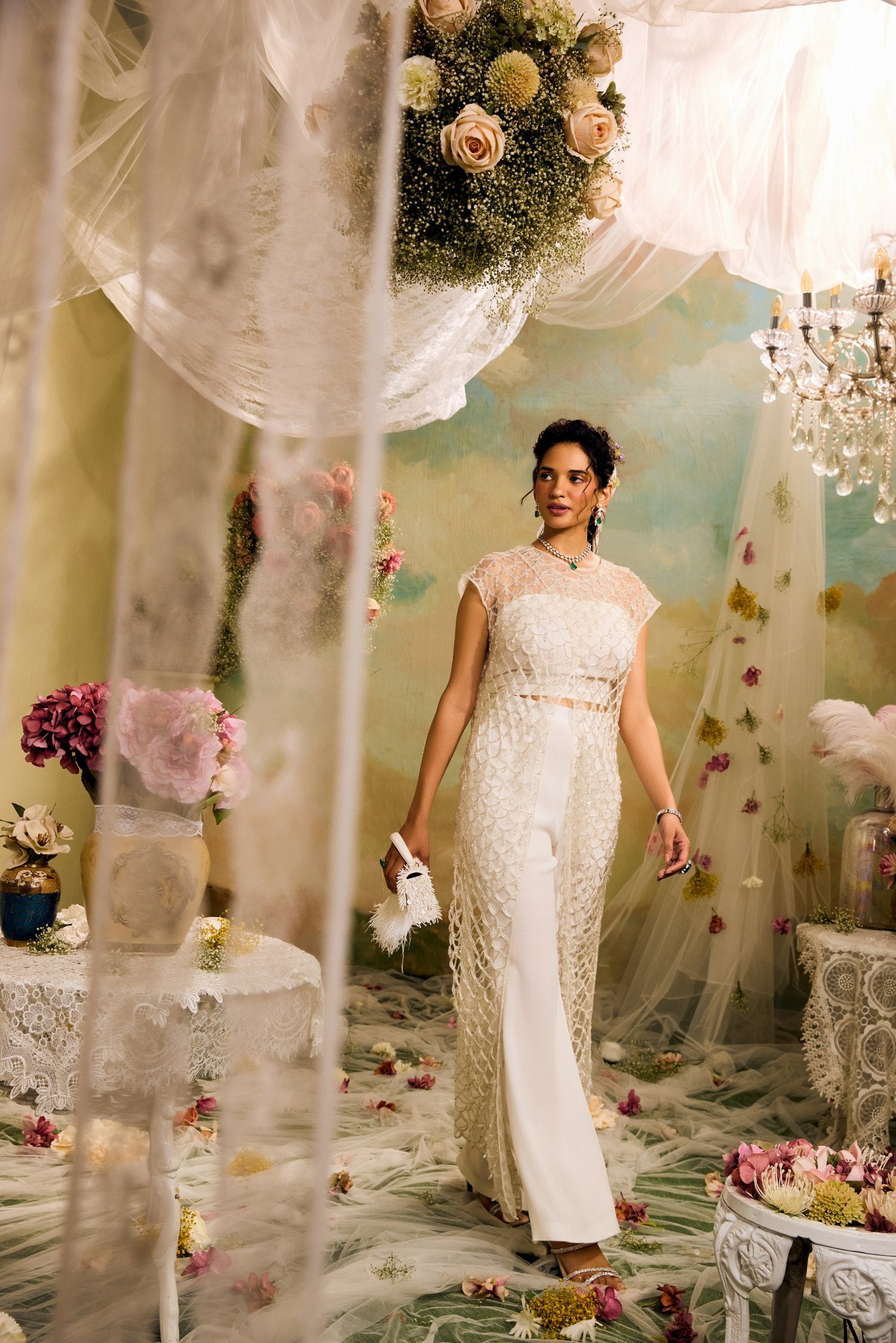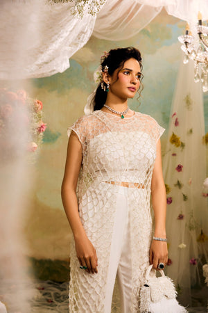 Asymmetrical cape with tassels and cutwork detailing with an ethereal inner and trousers make for a statement that all influencers need to be making
