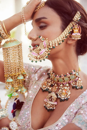Pariza clip on kundan and meenakari lotus nosering with palki, pearl curtains, and green kharbooja piroi.