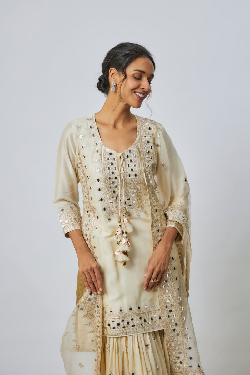 This sharara set features kurta with intricate mirror work and delicate embroidery complemented by a voluminous sharara, adorned with scattered embellishments and a border of detailed mirror work. It's completed with a dupatta with sparkling sequins and bordered with intricate patterns.