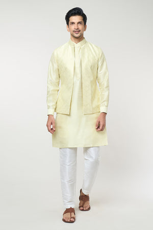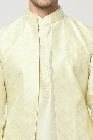 Parrot Green dupion silk based open jacket, enhanced with diamond pintuck embroidery, paired with a matching embroidered dupion silk kurta and an off white dupion silk based mexican pants.
