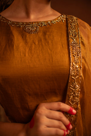 Mustard Satin Linen Rich Kurti With Dabka Hand Work Paired With Parsi Salwar And A Dabka Work Dupatta.
