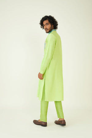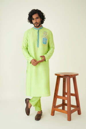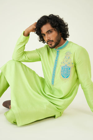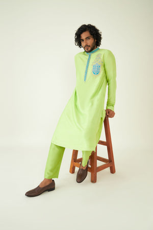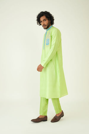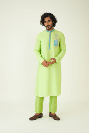 This color block embroidered kurta is perfect for adding vibrancy and style to your festive and celebratory moments. The striking green pattern instantly grabs attention, making it a standout choice for special occasions and celebrations.