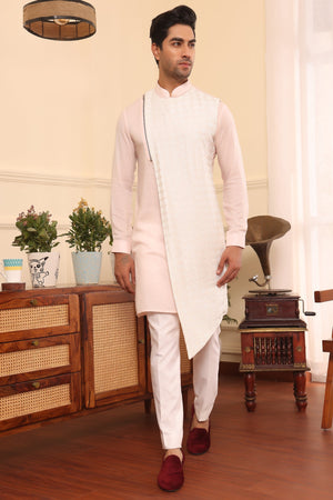 Dreamy elegance in every detail – our Pastel Pink Asymmetrical Kurta Set. Embrace the charm of asymmetry and the serenity of pastels in this graceful ensemble.