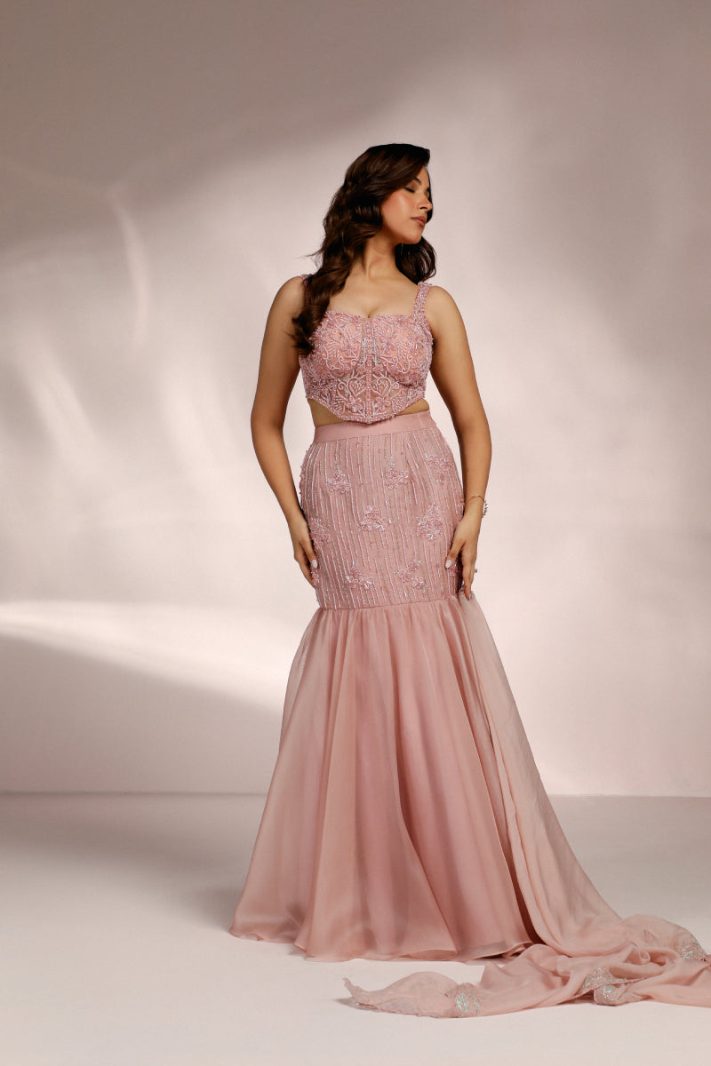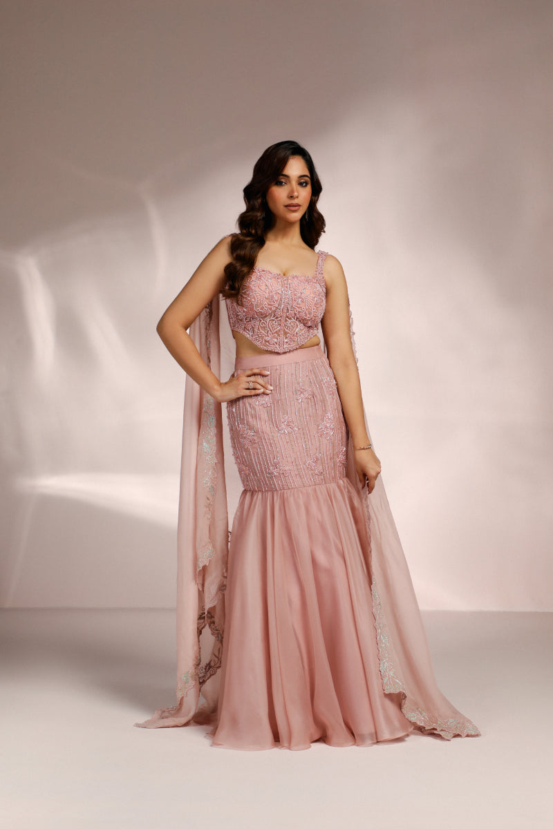 Pastel Pink Fishcut Saree With Corset Bustier And Dupatta Set