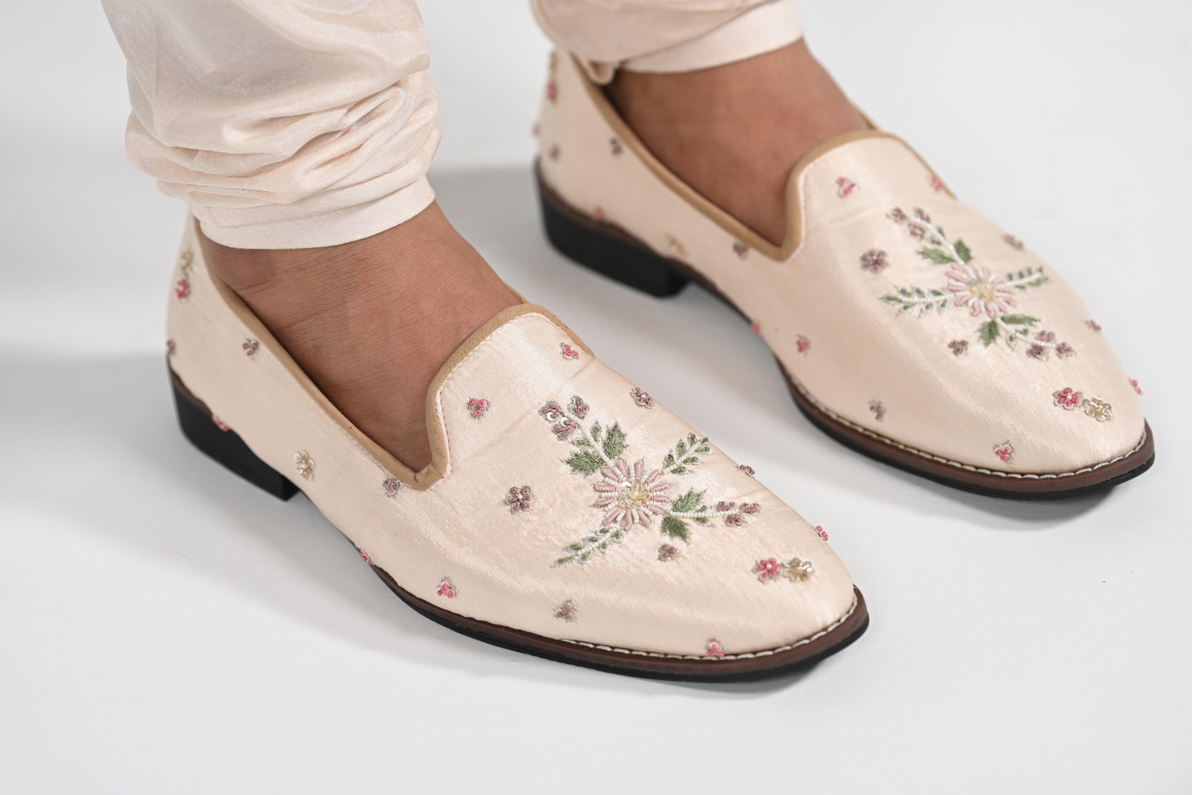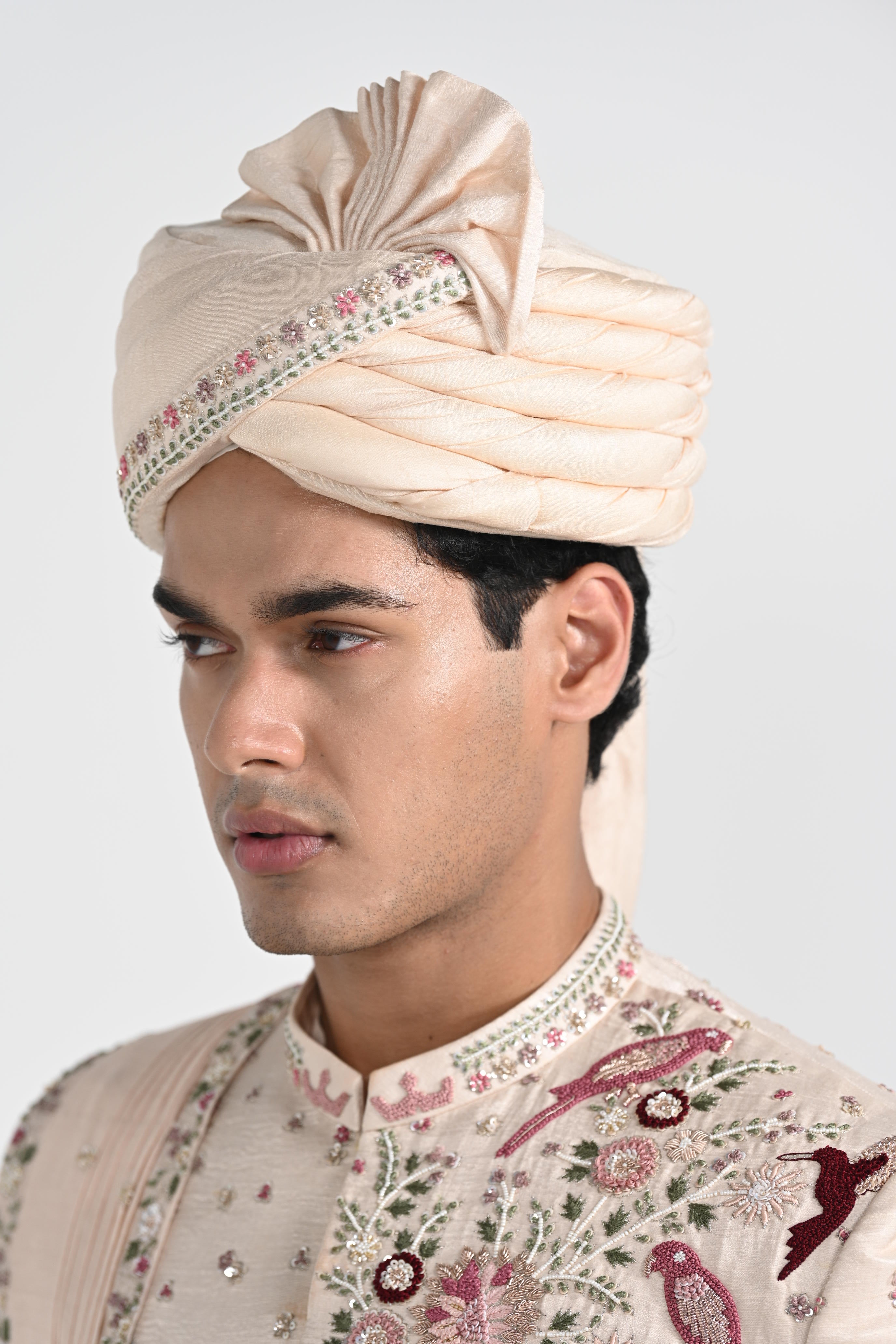 Pastel Pink Floral hand work embroidery along with thread work detailing on the Sherwani crafted on lilen satin .Paired with Pastel Pink Anarkali kurta ,churidar,belt,duptta ,sevra,tani,safa and jooti carfted on bambergraw silk . Color of the actual garment may vary due to lighting conditions during the shoot .