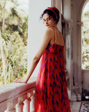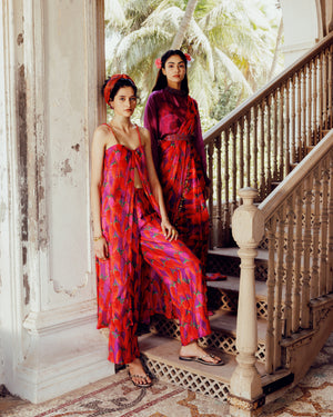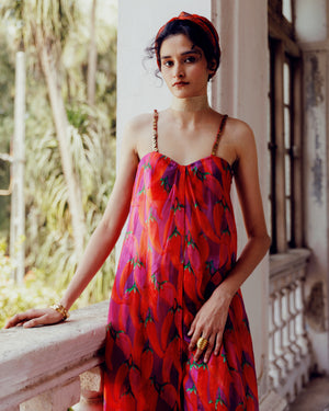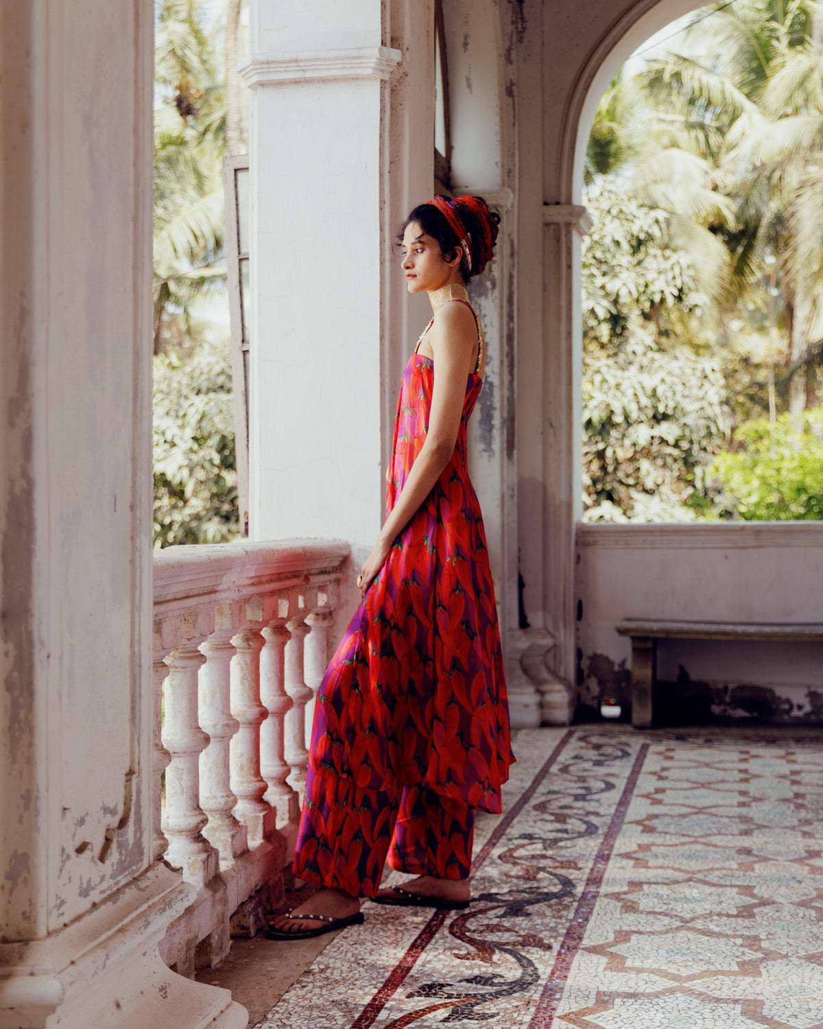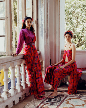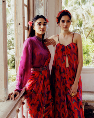 Purple Chilli Print Tube Knot Flap Slit Kurta With Coin Strape And Pants