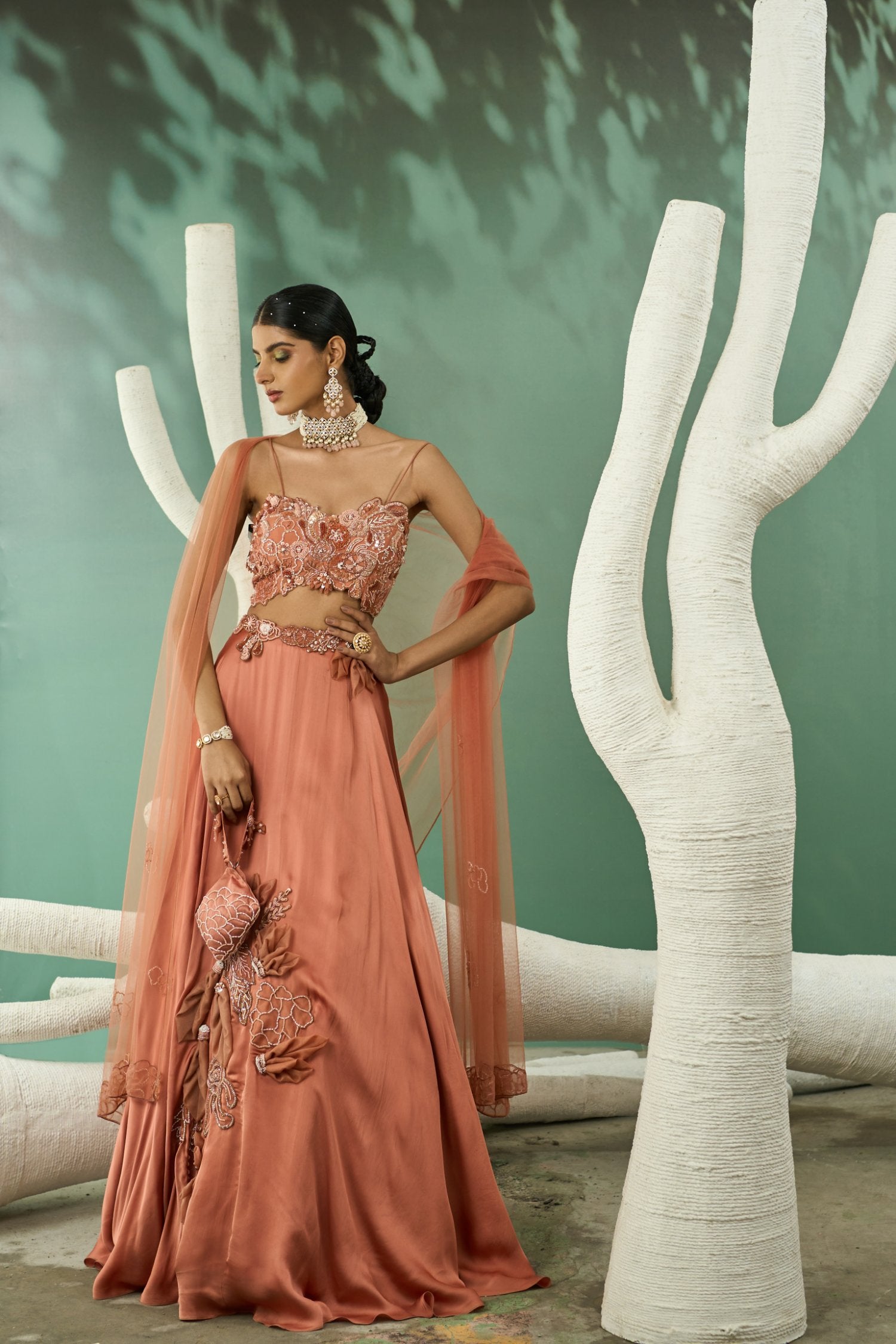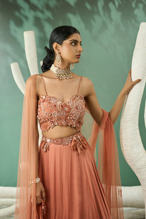Featuring peach applique lehenga in satin organza comes with a crepe blouse and tulle dupatta. Finely hand crafted using traditional embroidery techniques like bullion knots, french knots, 3d hand embroidery, loaded stitches with resham, katdana, sequence,anchor thread, beads.