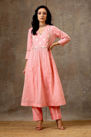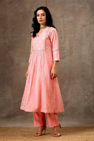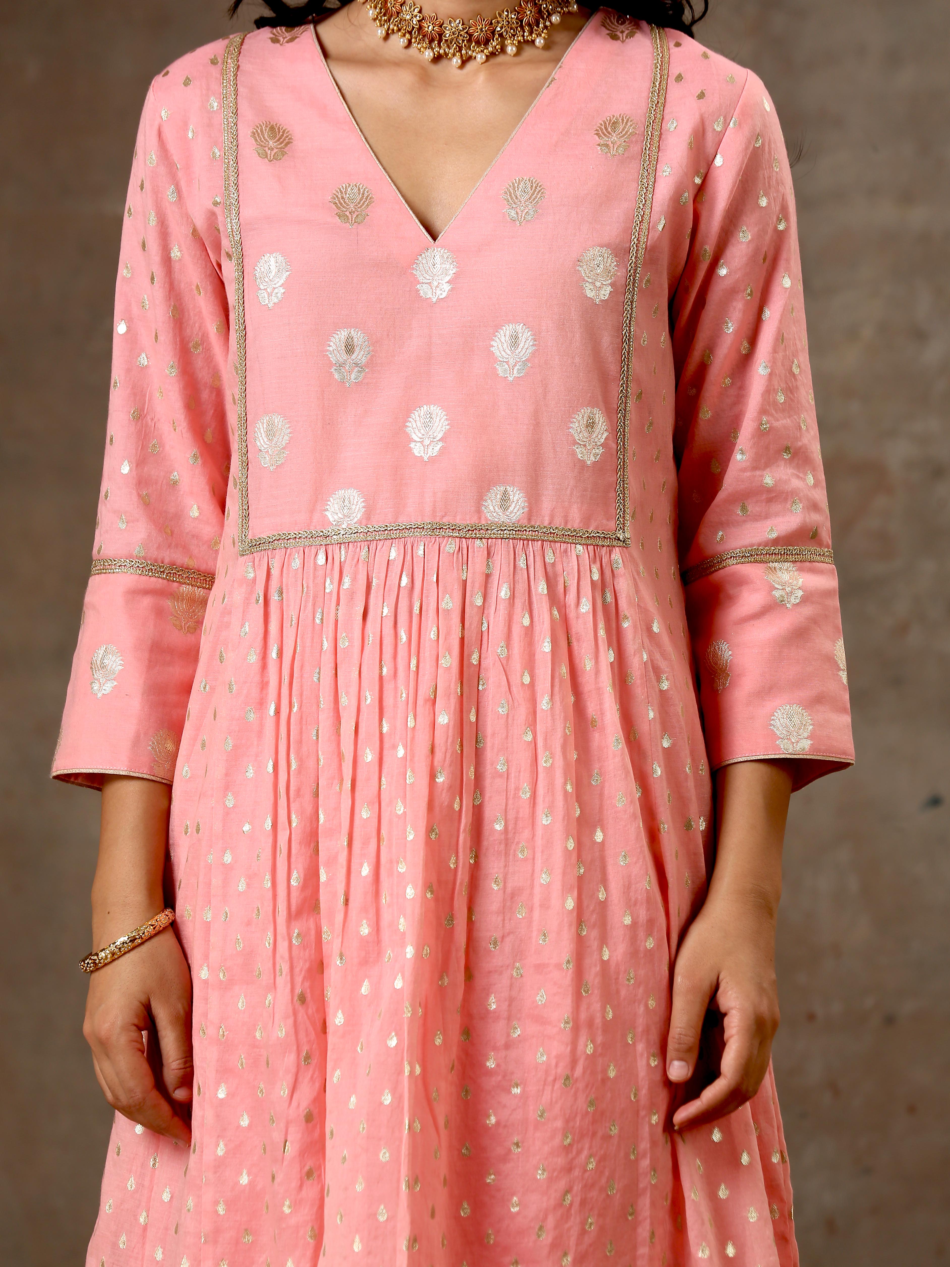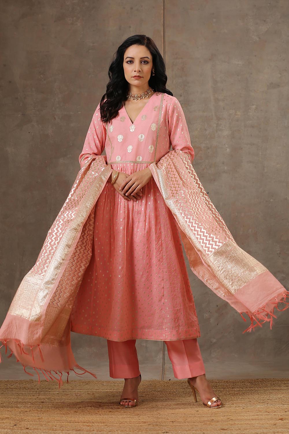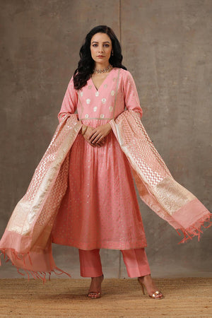 Peach Banarsi Chanderi Silk Yoke Kurta Set