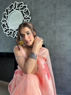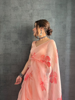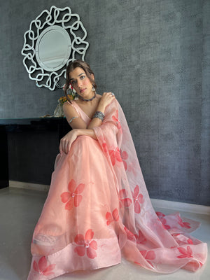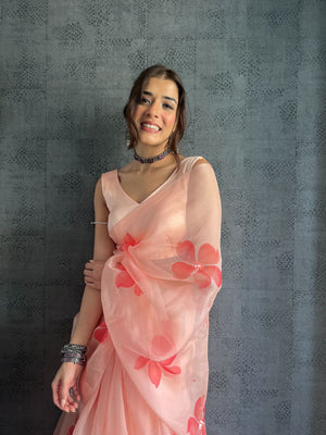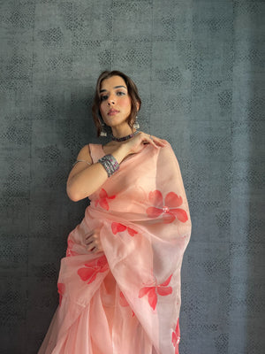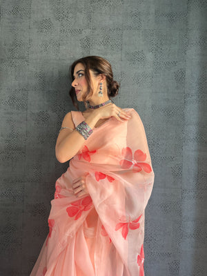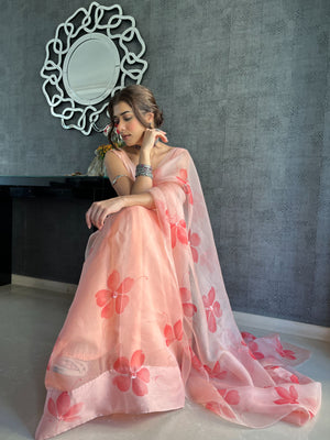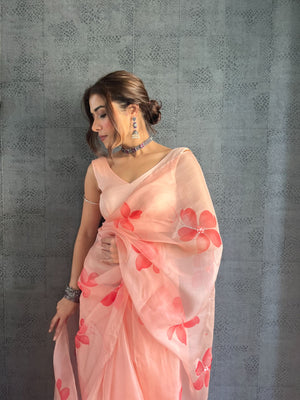 Peach Base Pure Organza Saree Hand-Painted With Coral Red Flowers Enhanced With Sequins