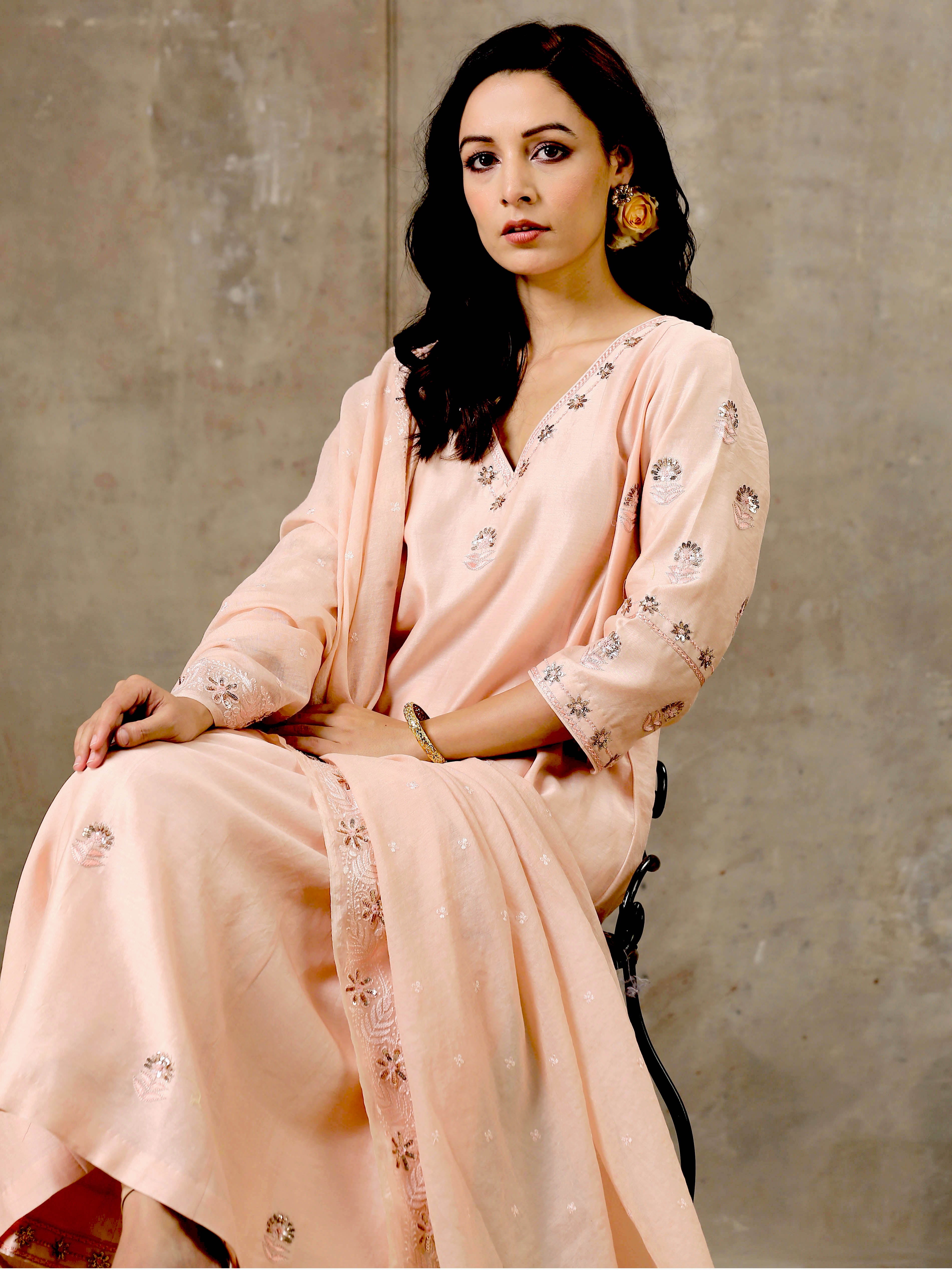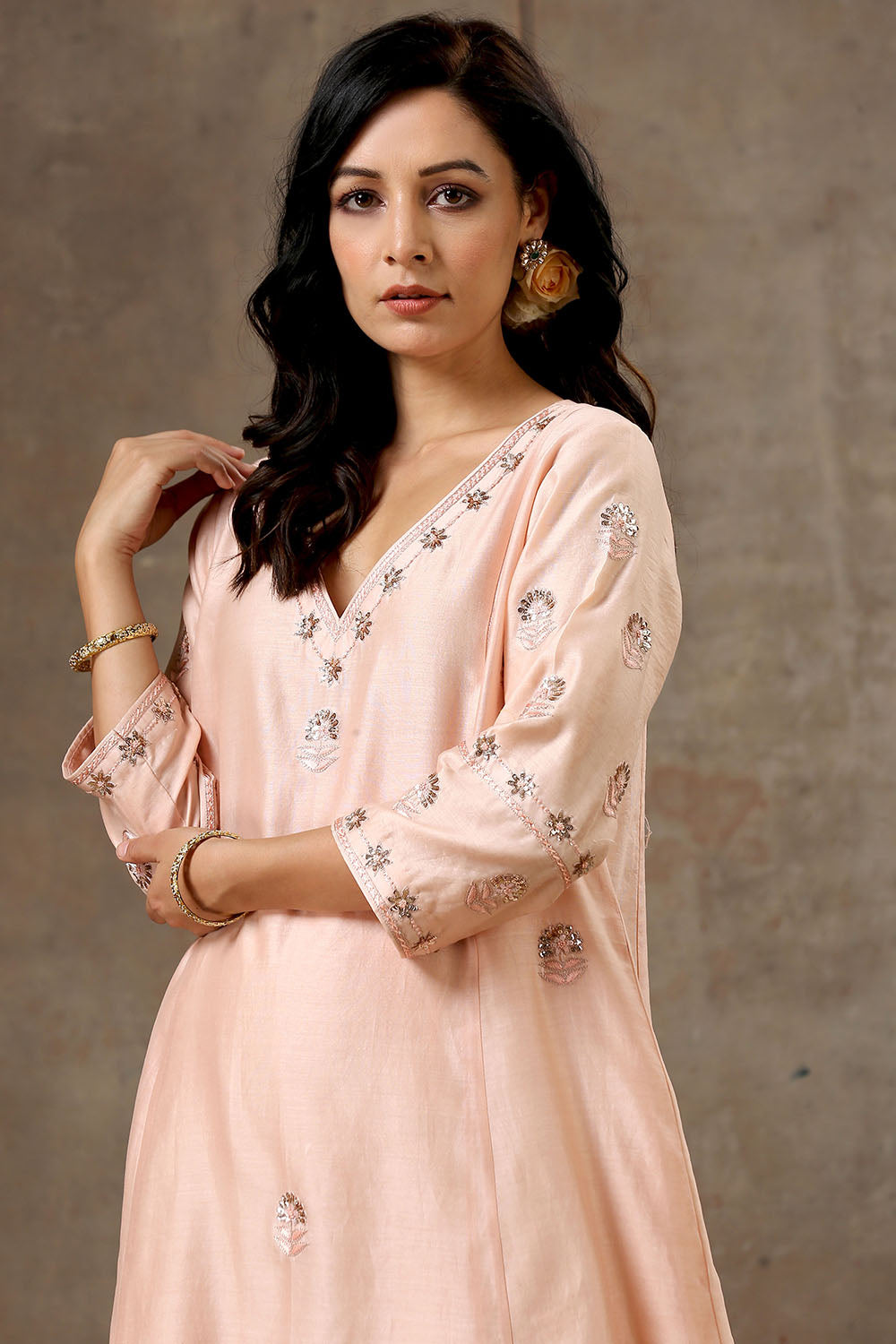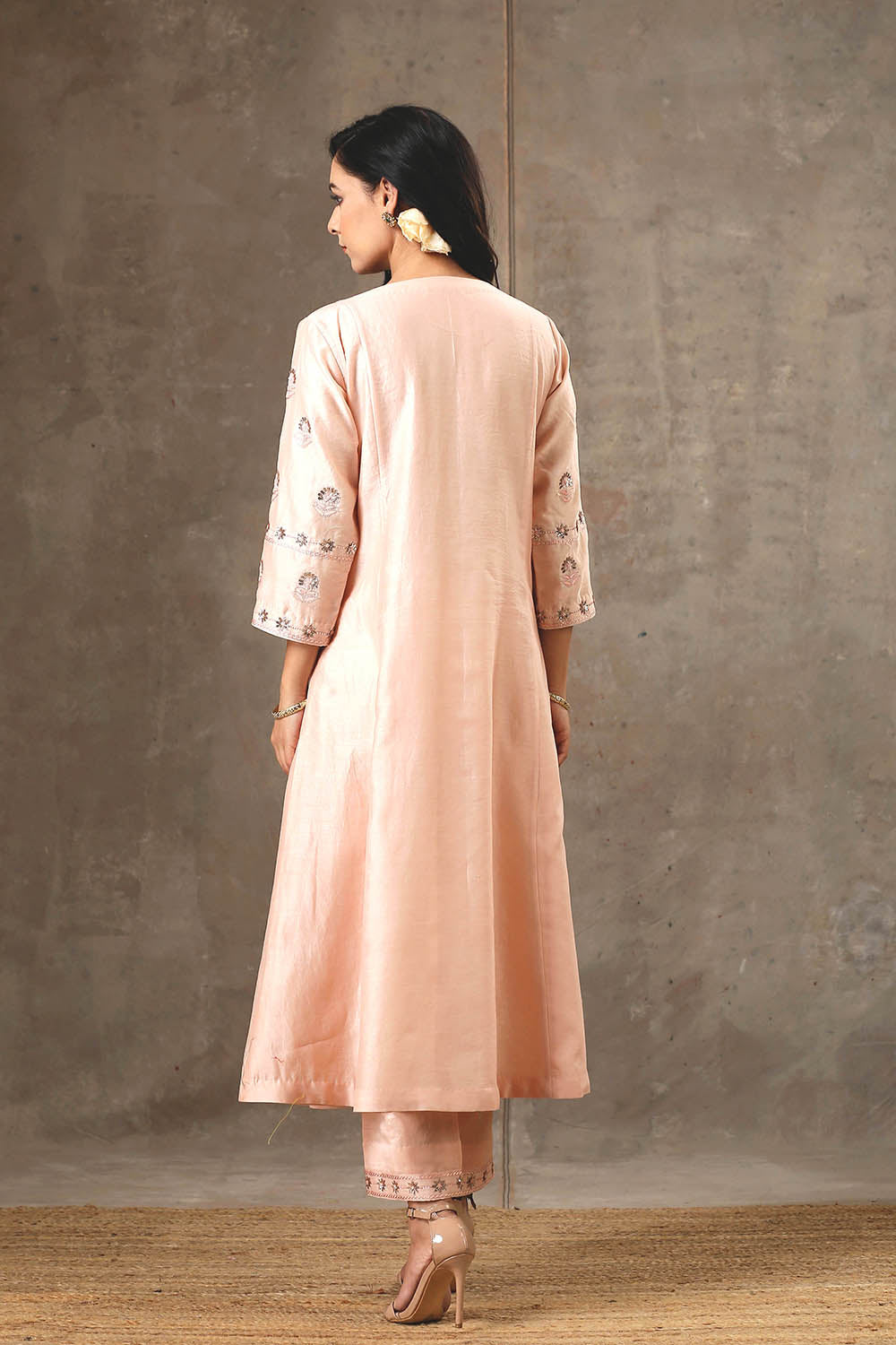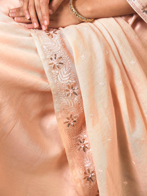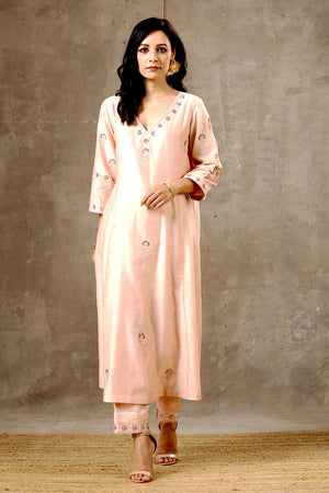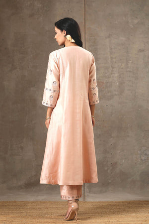 Peach Color Hand Embroidered Chanderi Silk Kurta Set