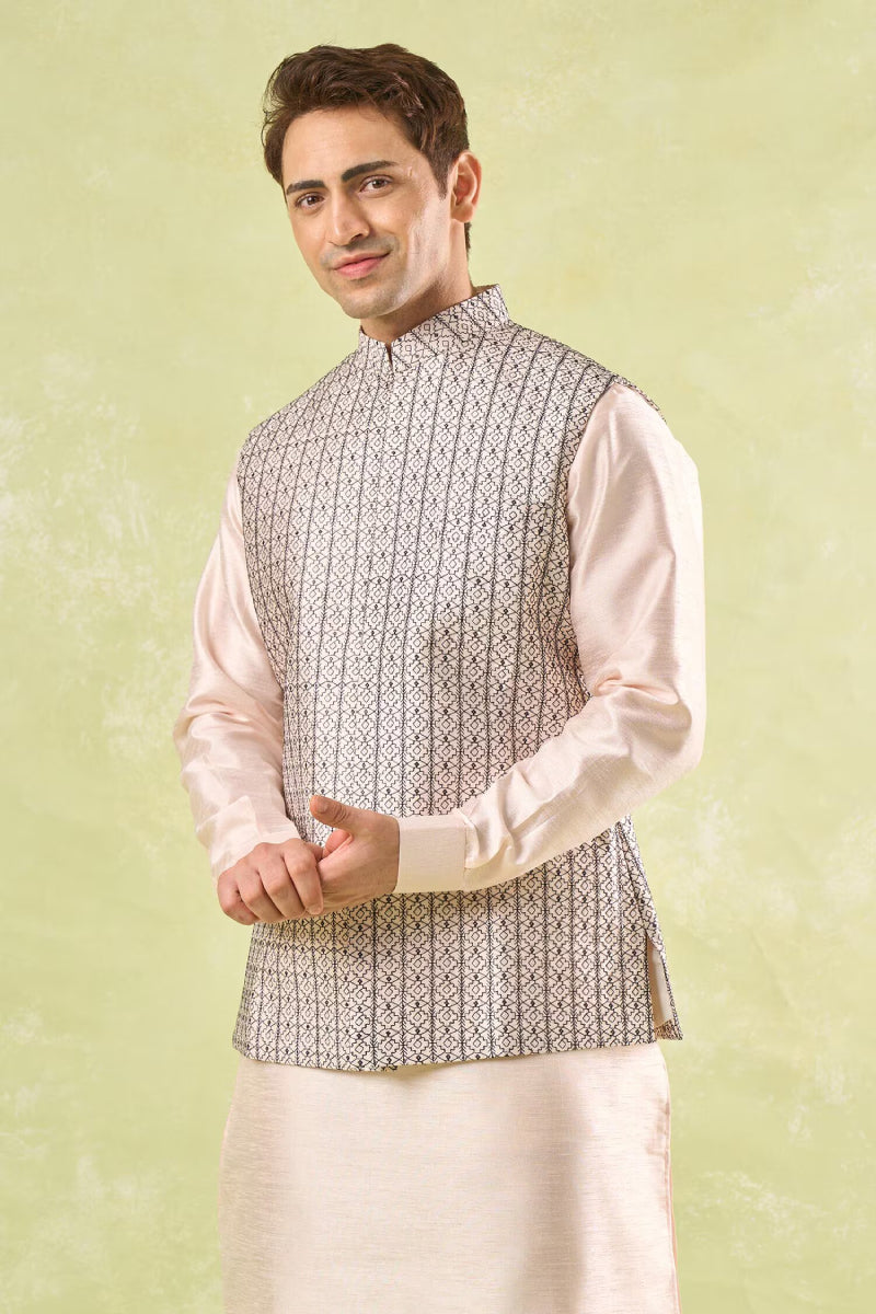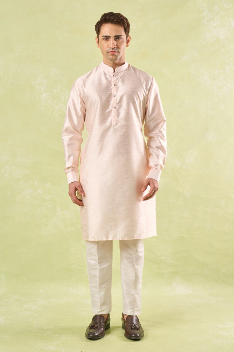Peach raw silk based jacket enhanced with thread embroidery paired with an off white dupion silk based kurta and an off white dupion silk based mexican pants.