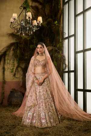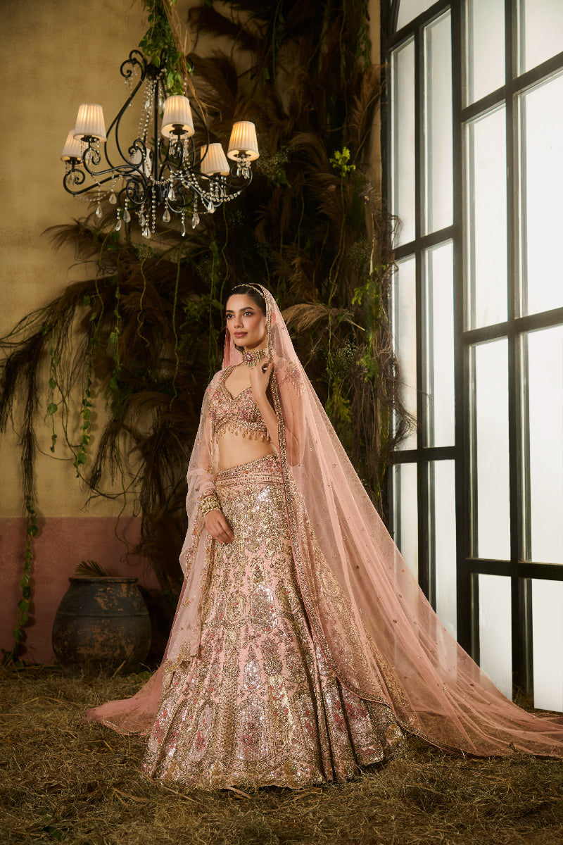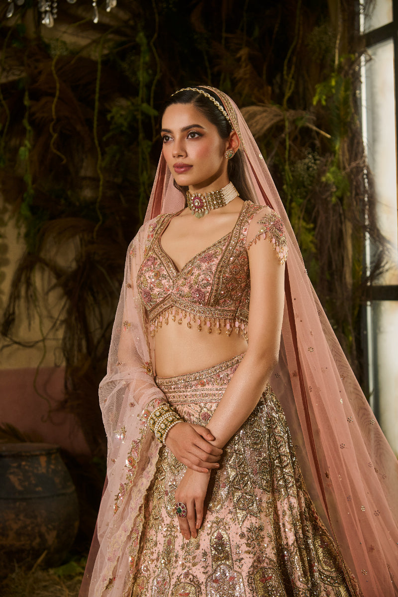 Peach gold zardosi embroidered Lehenga paired with blouse, embroidered tulle dupatta and veil