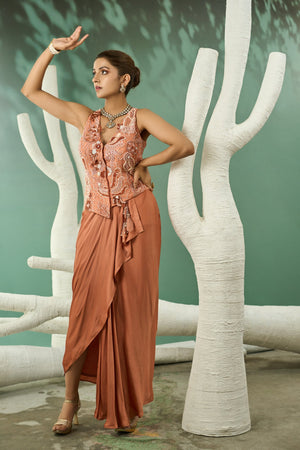 Featuring coordinated peach halter neck jacket in habutai silk comes with an asymmetric drape skirt in satin silk. Finely hand crafted using traditional embroidery with resham,anchor, katdana, sequence, beads and 3d hand embroidery.