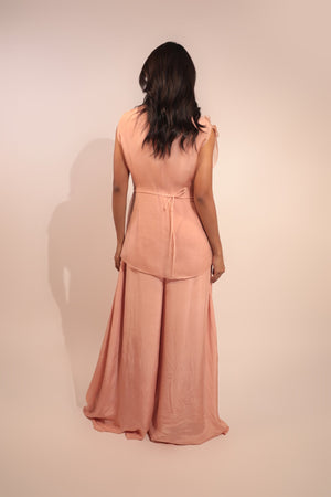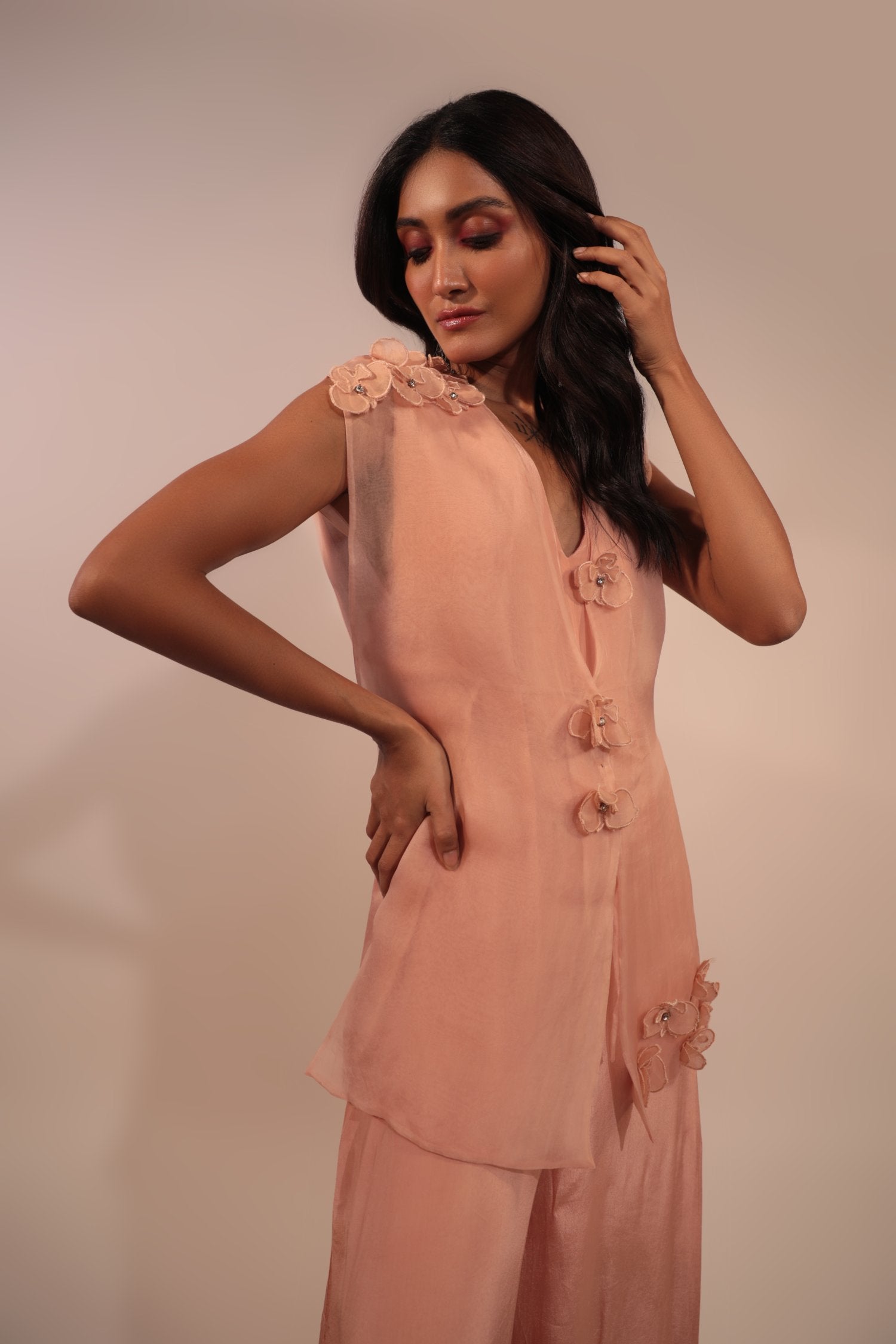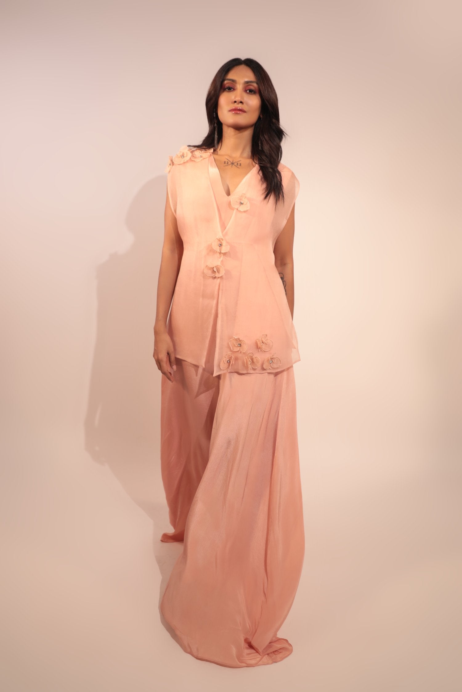 Peach Crepe Jumpsuit And Tie-Up Organza Jacket With 3D Flower Detailing