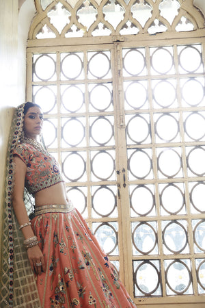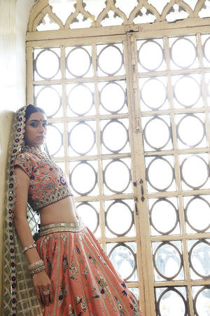 Lehenga: Peach silk 24 kali lehenga with abstract story pattern thread work and zari embroidery | Choli: Peach silk leaf shape neckline, cap sleeves choli with abstract story pattern thread work and jari embroidery | Dupatta: Sage net dupatta with 1" geometric border with Tassels
