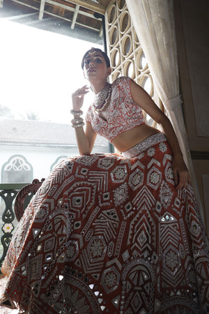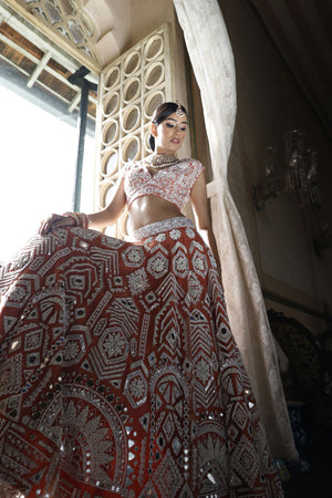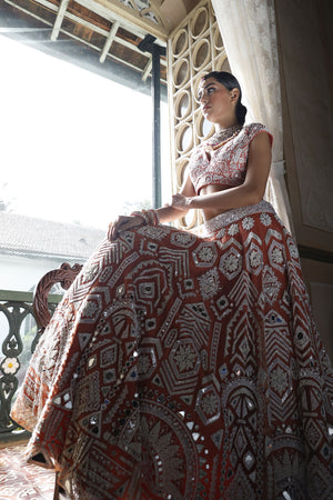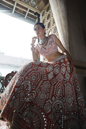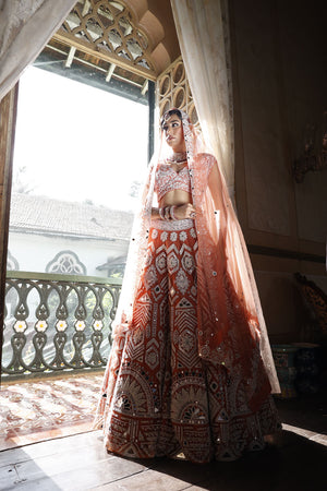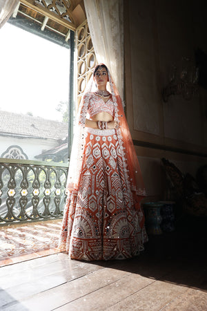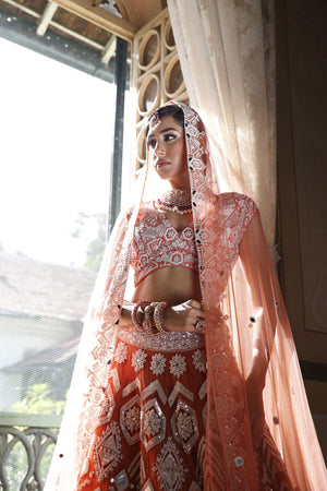 Lehenga: Peach net lehenga with cutdana. mirror and sequins work all over in geometric form with 2" embroidered waistbelt | Choli: Peach silk choli with pan shape neckline and cap sleeves have geometric embroidery all over with sequins, mirror and cutdana with back tie-up dori with tassels for finishing | Dupatta: Peach net dupatta with geometric border and mirror butti all over with tassels for finishing