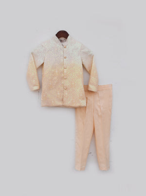 Experience sophistication with our Peach Ombre Bandgala Set, featuring a Sequence Embroidery Achkan with soft lining and full sleeves. The gradual transition from light to dark adds an extra layer of allure. Self buttons highlight the ensemble's elegance, while the Peach Pant without lining ensures comfort and a contemporary finish. Elevate your style with this timeless yet modern outfit, perfect for a range of occasions.