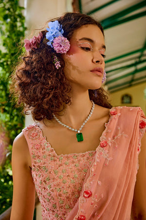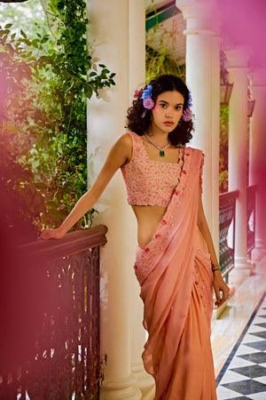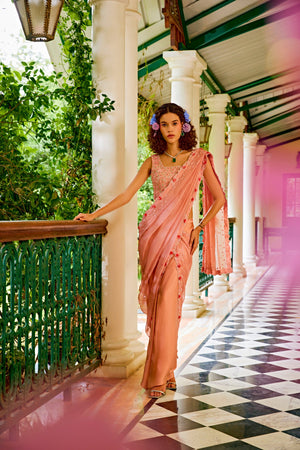 Discover ethereal beauty in our light peach satin pleated pre-stitched saree set. The organza border frames an intricately embroidered pallu, adorned with delicate sequins, threads, and 3D flowers. Paired seamlessly with a chanderi blouse featuring integrated and delicate embroidery. This ensemble radiates luxury and is perfect for weddings, upscale events, and celebratory gatherings. Elevate your presence with this opulent attire, capturing attention and admiration effortlessly while harmonizing traditional aesthetics with contemporary allure. Model Info: