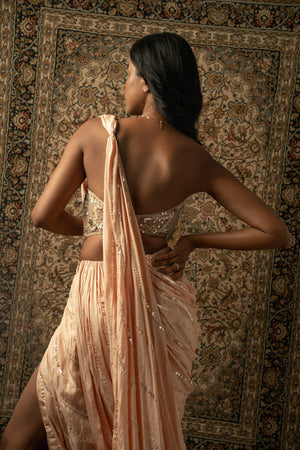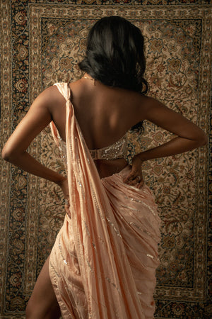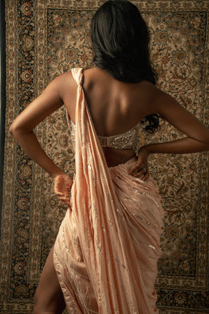 This baby peach pre-draped saree is a vision of elegance, crafted from Linen Satin fabric that glimmers with every movement. Paired with a Net blouse, the ensemble radiates sophistication and charm. The intricately hand-embroidered blouse adds a touch of glamour, making it perfect for a cocktail or reception, whether for the bride or her bridesmaids. With its timeless allure and delicate detailing, this saree is sure to captivate attention and leave a lasting impression on any special occasion.