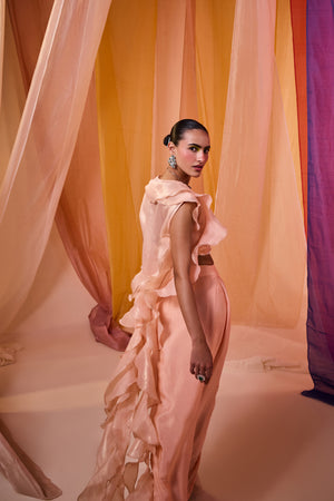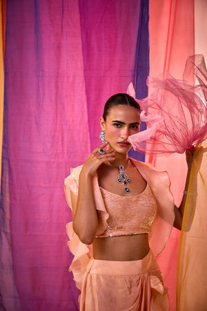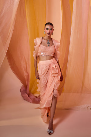 Peach Sequence Embroidered Blouse With Drape Skirt And Dramatic Ruffle Cape