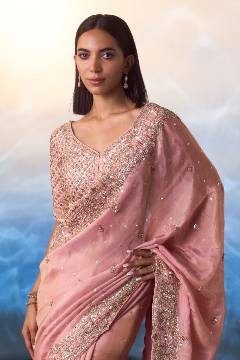 A peach tissue saree hand embroidered with sequins, bugle beads and crytals.