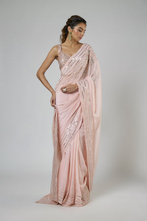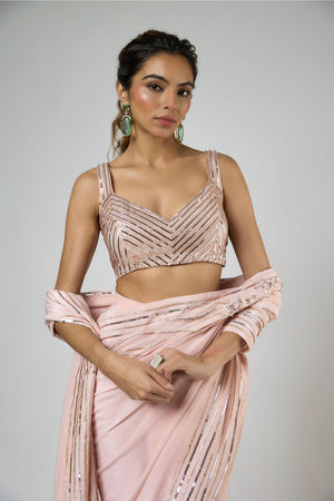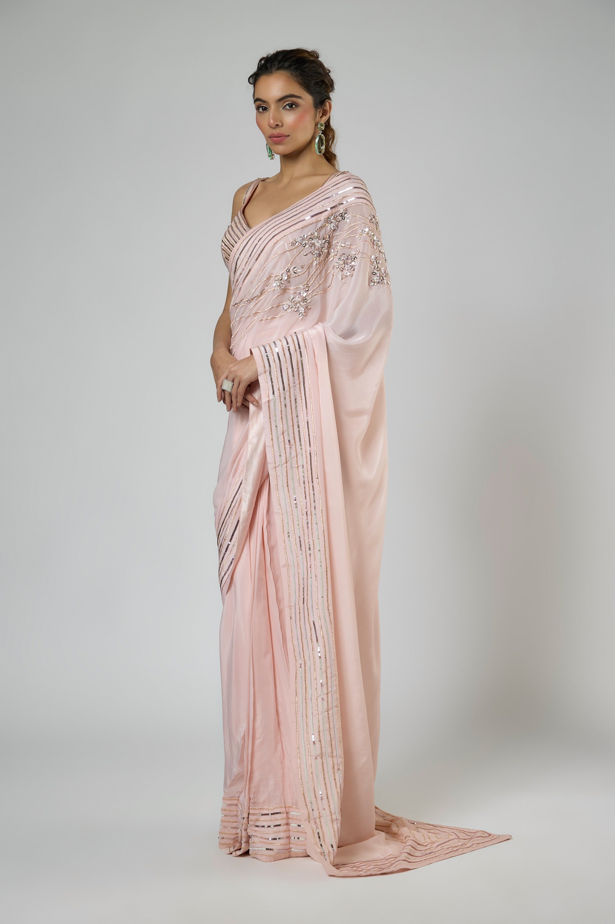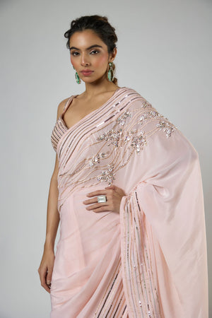 A statement peach-pink saree that celebrates modern femininity. The fluid Fuji crepe drape is elevated with minimal floral embroidery on the pallu, styled with a V-neck incut sleeveless Tussar silk blouse that embodies effortless sensuality.