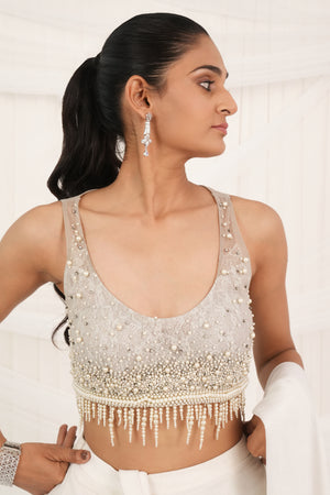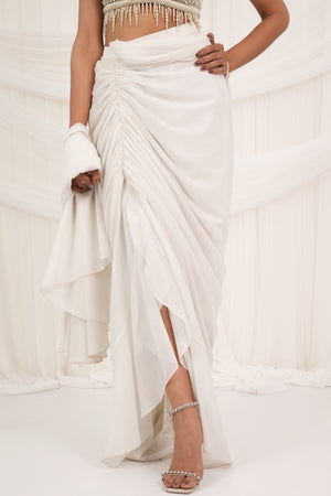 A metallic silver draped skirt with a bold side slit and structured detailing adds dramatic flair. Paired with an ivory blouse featuring pearl gradient embroidery and tassels at the edge, along with a sleek skinny dupatta, this ensemble is a perfect mix of glamour, grace, and contemporary elegance.