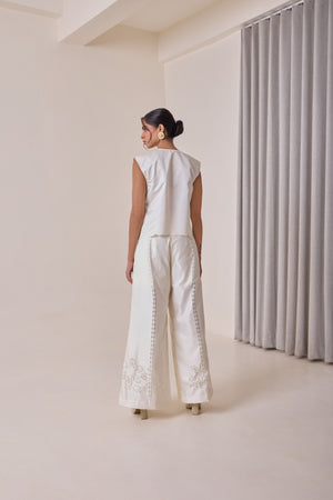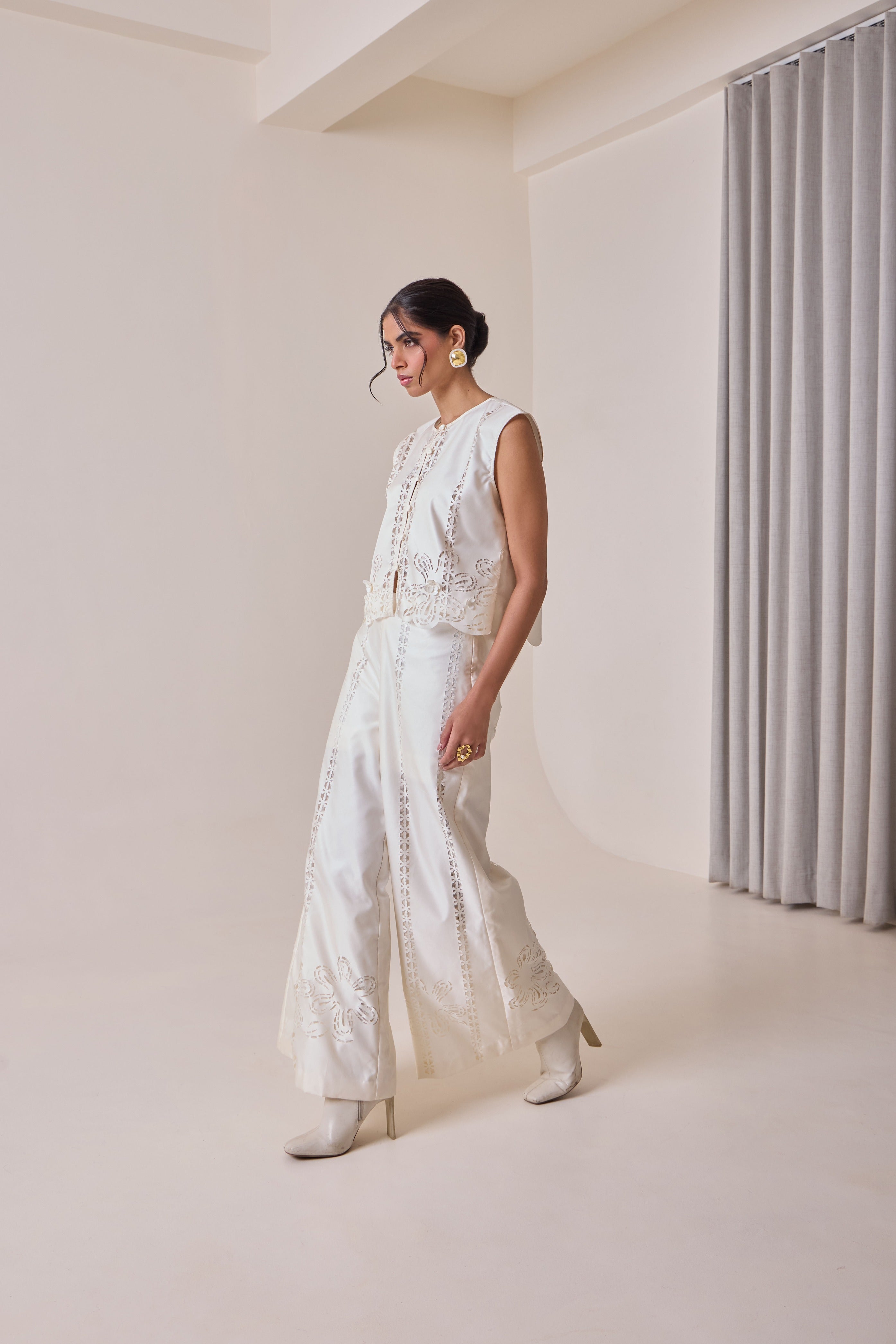 Crafted in structured taffeta, this creme cropped jacket features intricate laser-cut floral embroidery layered over fine mesh. Designed for a sculpted yet feminine silhouette, it’s a standout piece — refined, luxurious, and distinctively detailed. Pairs perfectly with the matching flared trousers for a coordinated statement look.