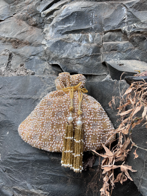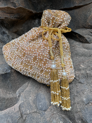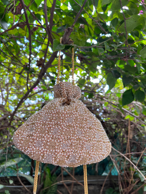 Gold modish base with criss & cross delicate shaded gold and pearl work with a hint of silver.