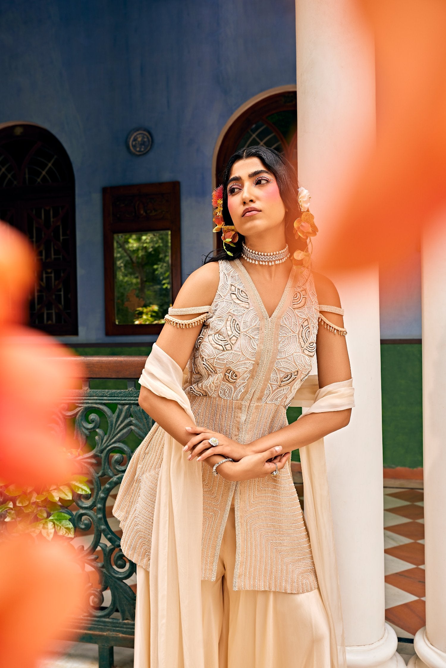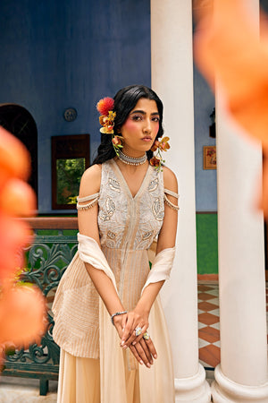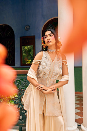 A short halter neck kurta adorned with intricate pearl and katdana work, paired elegantly with a satin sharara and ethereal organza dupatta. Perfect for lavish festivities, weddings, and celebratory events, where timeless style meets modern sophistication. Elevate your wardrobe with this exquisite ensemble that captures the essence of opulence. Model Info: