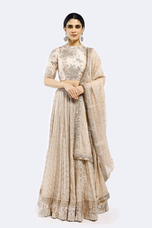 Organza Lehenga set featuring an embellished, elbow sleeve modest choli, an A-line skirt with broad embellished edge and a minimally embellished dupatta. Embellishments include Badla, Cotton thread, sequins, pearl and cutdana.