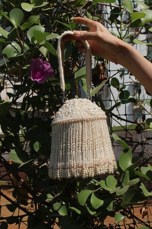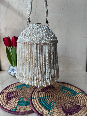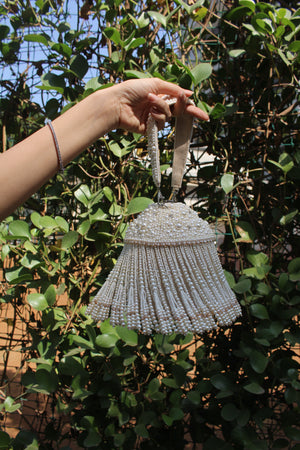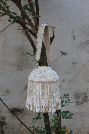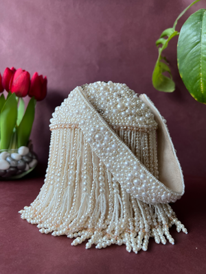 An incredible off white potli decorated with pearls n tassels all over and a little lock on the top, making it a convenient and fashionable addition to any outfit.