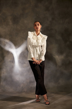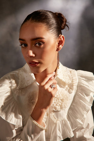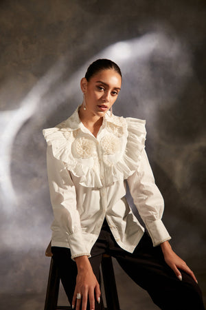 Cotton poplin shirt with hand embroidered pearl embroidery on the collar and cuff with ruffles on the shirt