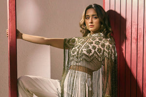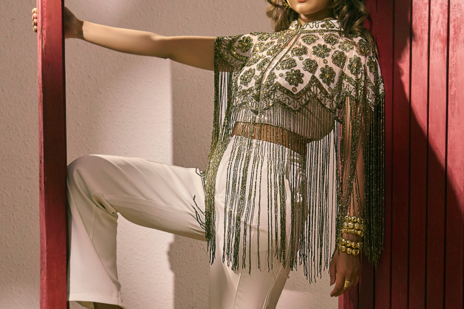 This cape absolutely knows how to capture a a fiercely elegant spirit and spread across sizzles & dazzles in every room you walk into. Elegant, Statement & trust form of art. The fabric has a slight stretch to be able to easily sit well on the shoulder alongwith a soft lining on neckline for added comfort & ease of wear. Hook button can be worn as a front open styled cape or back open style as it is a versatile look that can be worn with sari, pants, shorts, lehengas etc.