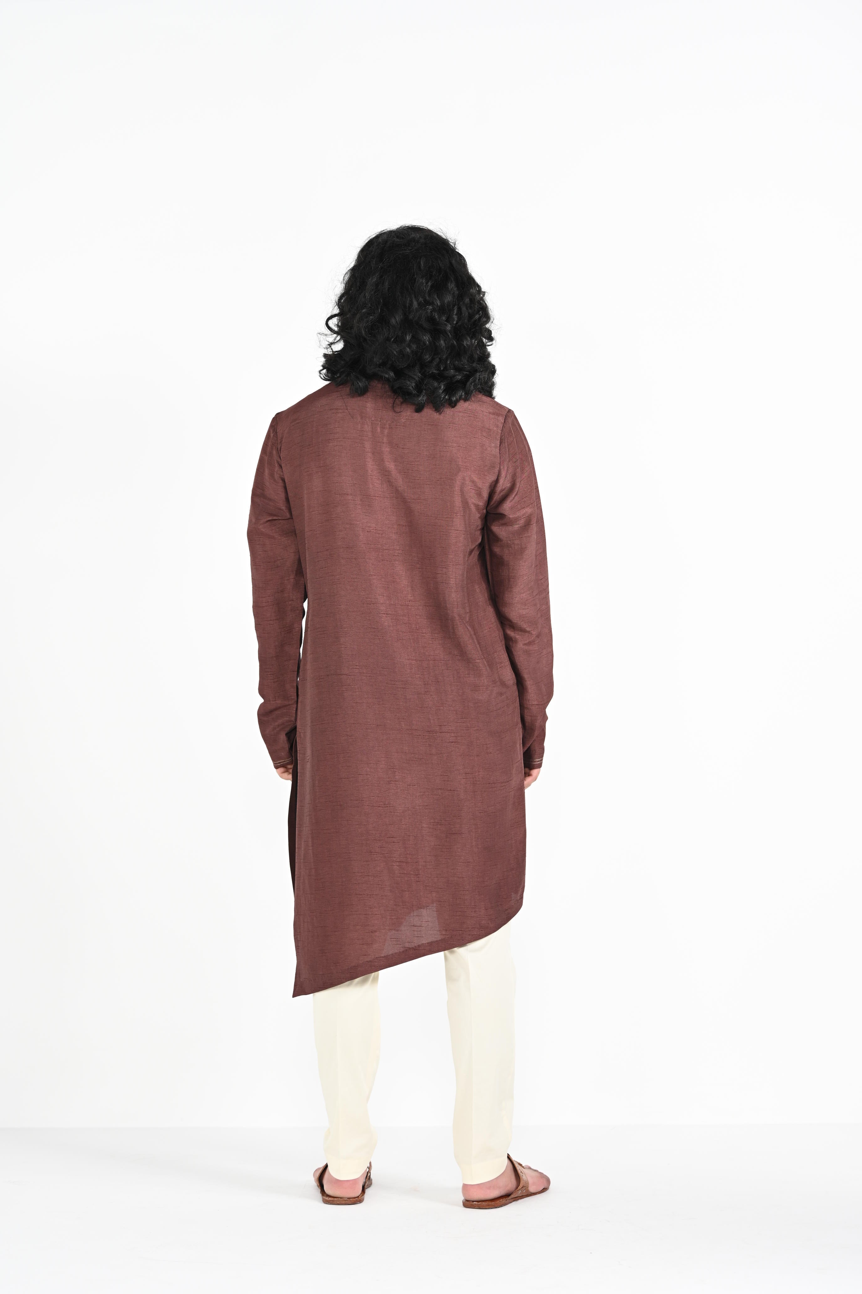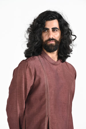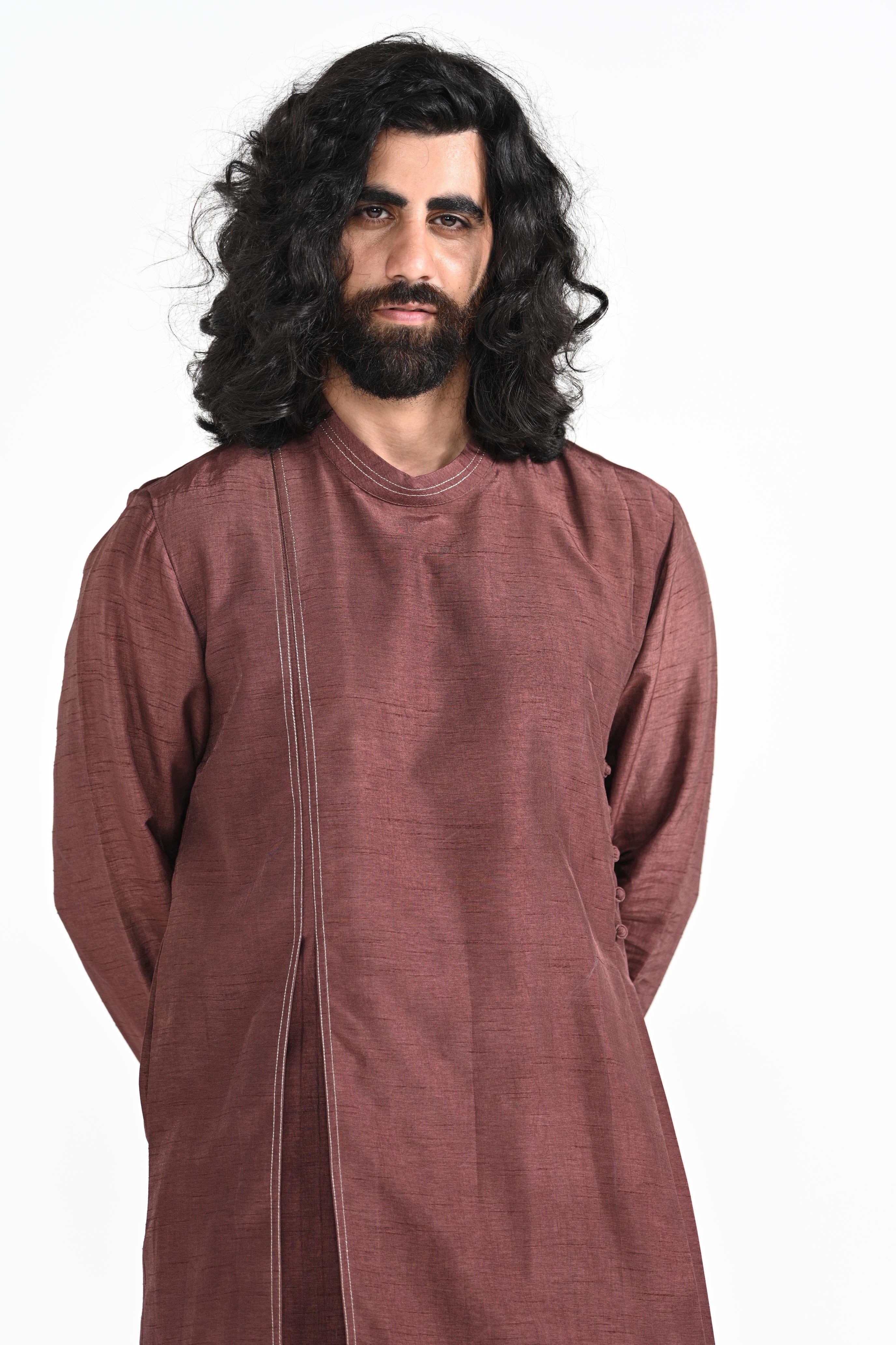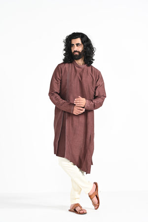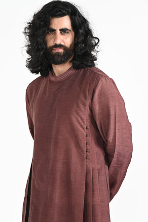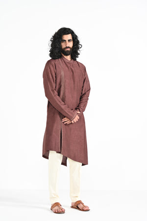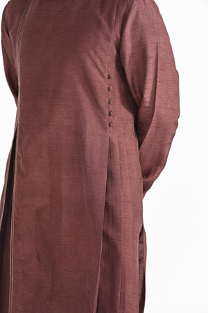 Pecan Pleated kurta with zari detailing on bamberg raw silk.Paired with Buttercream slim fit Pant Pajama. Color of the actual garment may vary due to lighting conditions during the shoot .