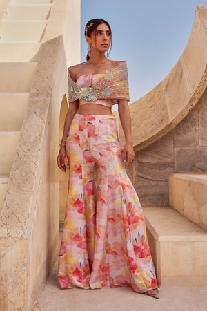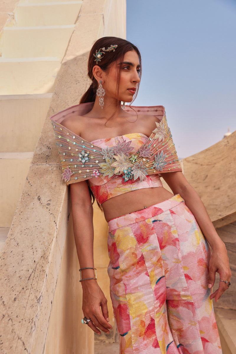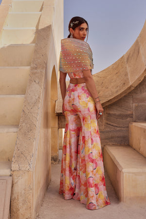 This vibrant set features a colourful georgette base adorned with water color sequin all over it. The structure corset blouse offers a defined silhouette and is complemented by a structured hand embroidered drape detail around the shoulder, Paired with flowing sharara pants.it is perfect for making a stylish statement.