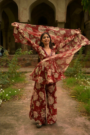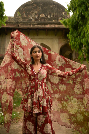 Maroon printed georgette peplum kurta with mirrors and embellished neckline, paired with sharara and silk organza dupatta with scallop embroidery and mirrors.