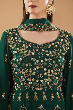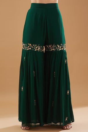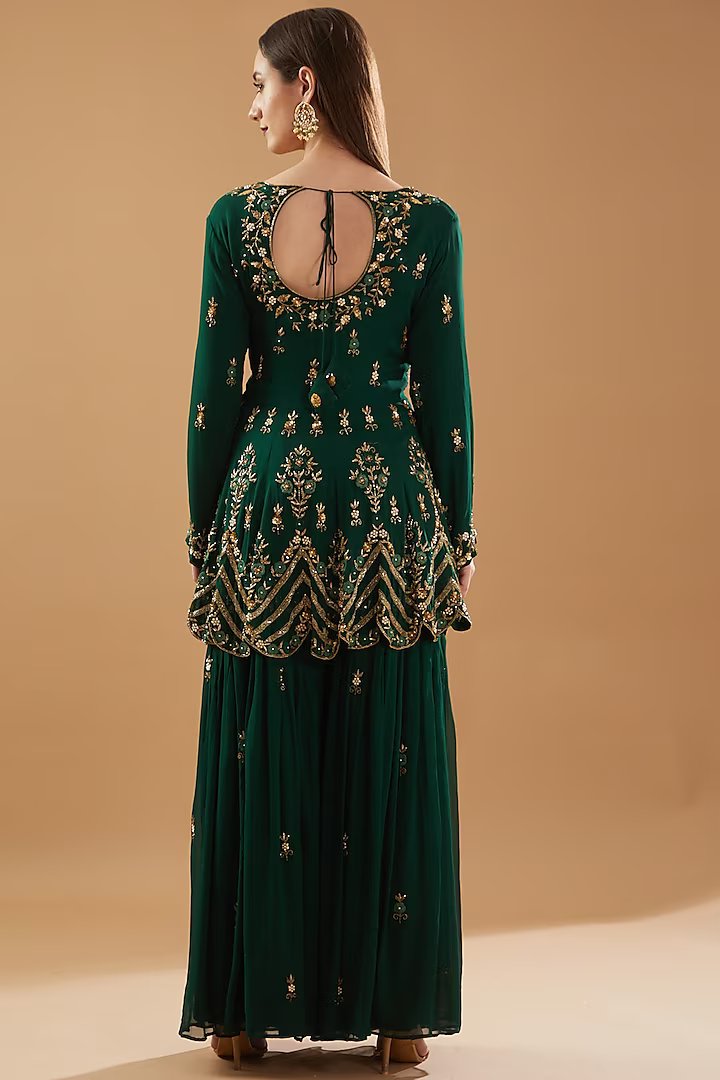 Bottle Green Peplum Kurta Paired with Sharara and Dupatta. Intricate floral and thread Embroidery on Georgette base makes this an outstanding for Eid collection.