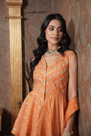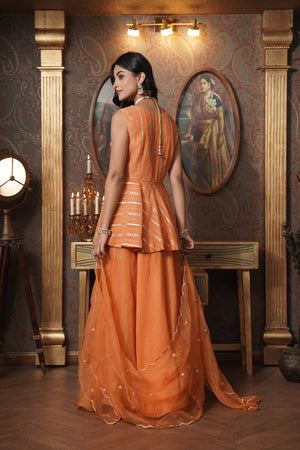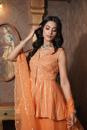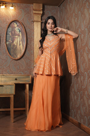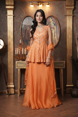 Introducing the Marigold Magic Peplum Set, featuring exquisite hand embroidery on a stylish front-open, sleeveless design with a flattering V-neck. This enchanting ensemble is complemented by a matching organza skirt and an elegantly crafted organza dupatta adorned with intricate detailing. Perfect for festive occasions, this set beautifully combines contemporary flair with timeless elegance.