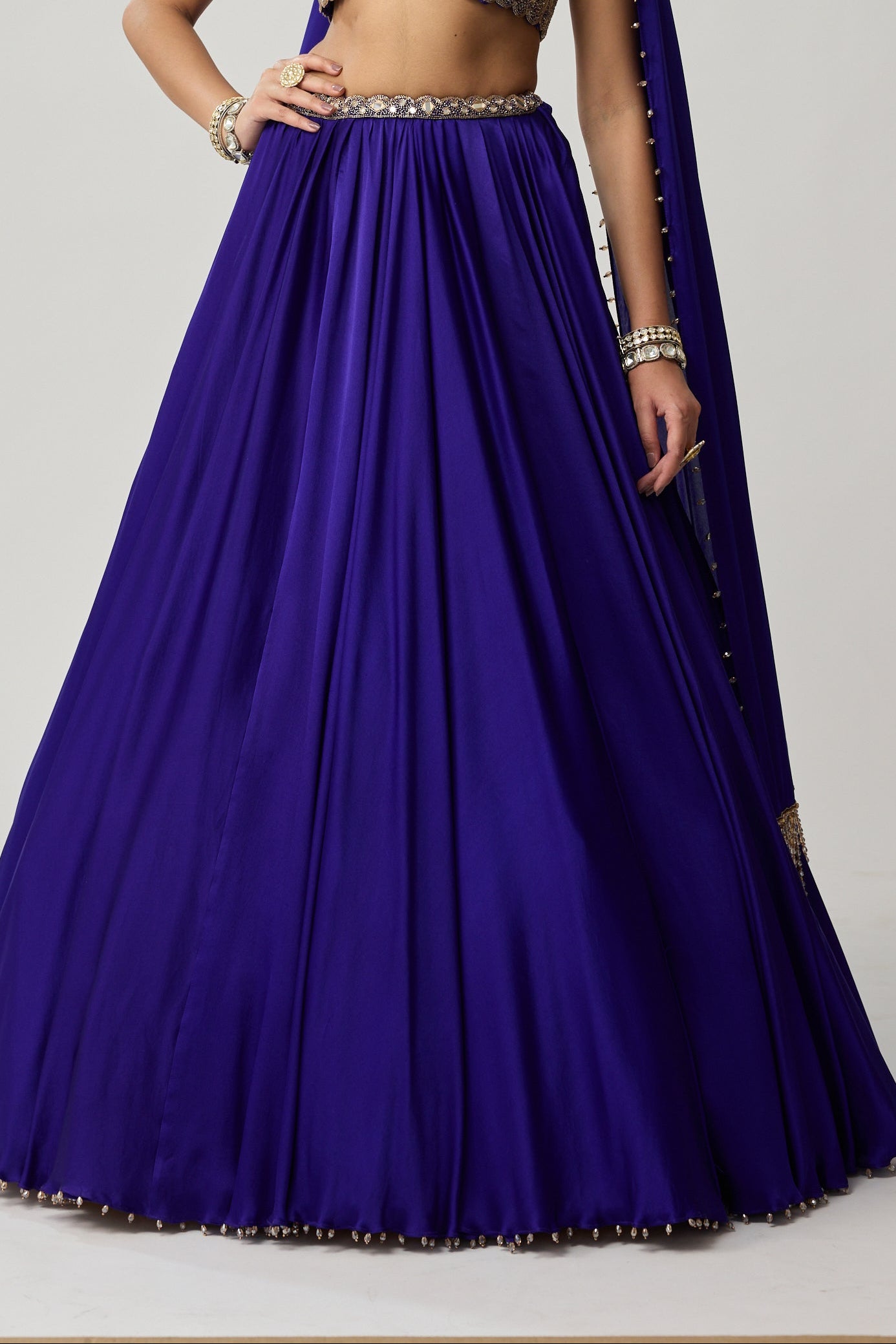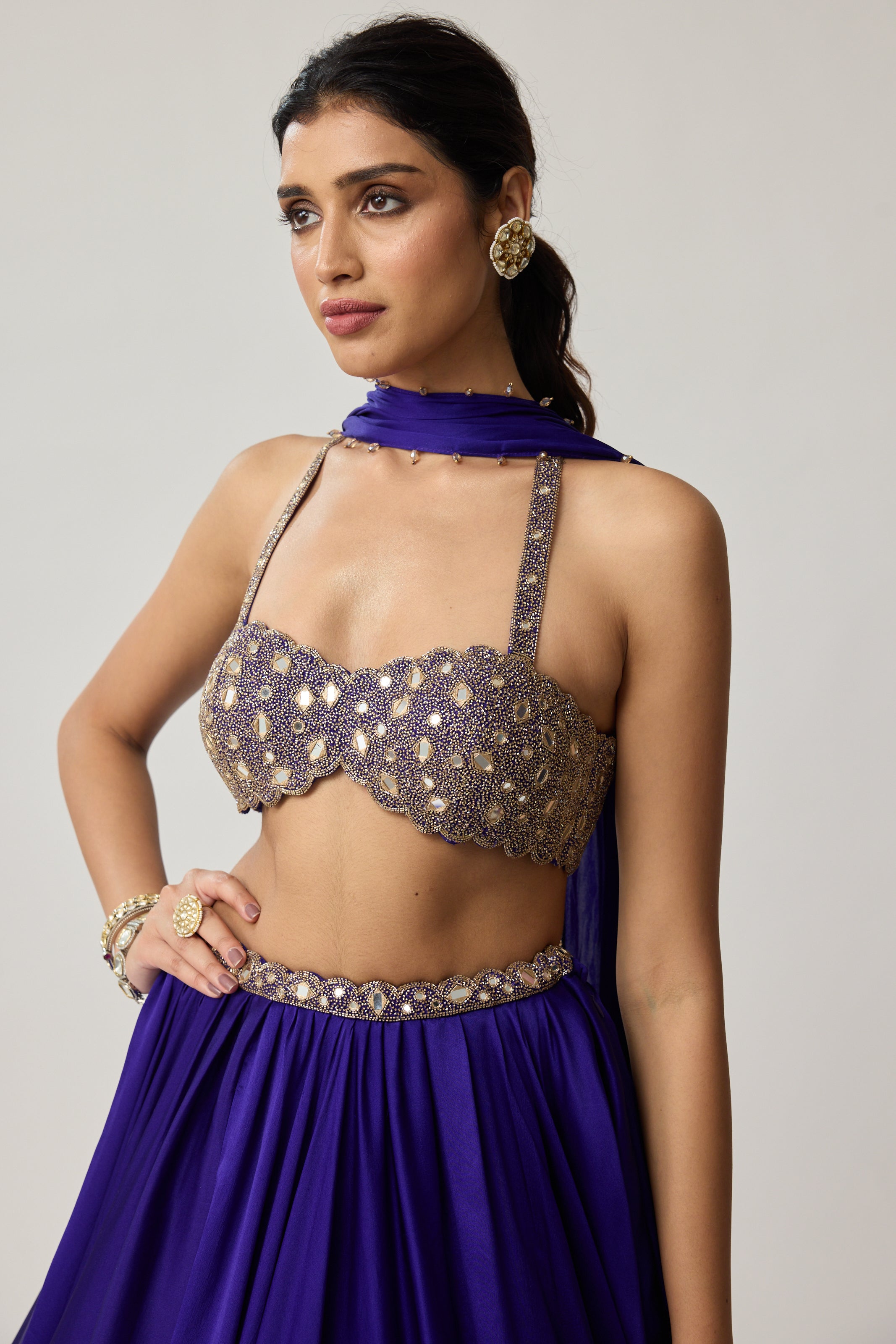 Persian Blue Satin skirt paired with a heavily Mirror embroidered halter neck blouse and Stole.