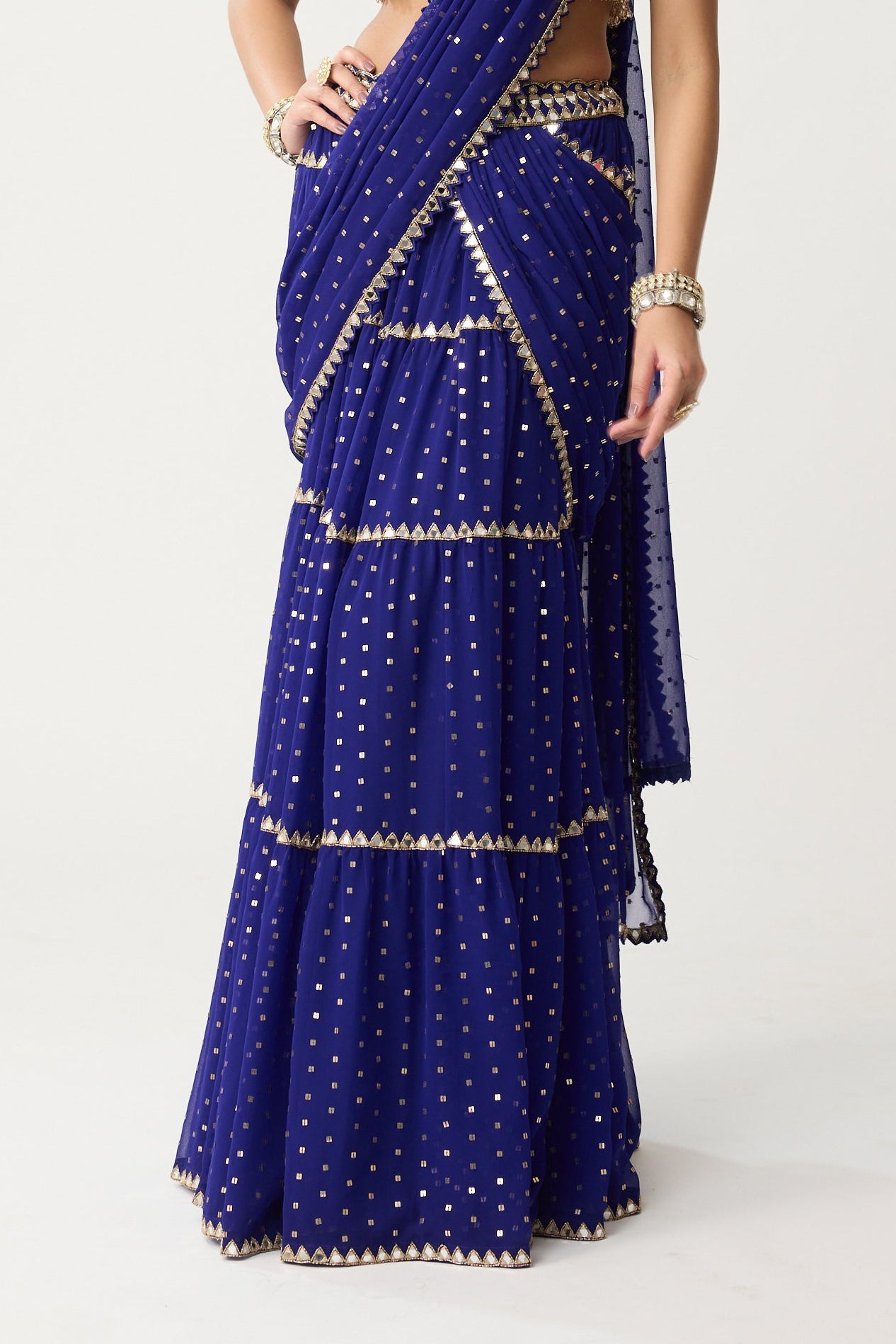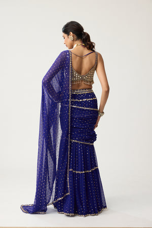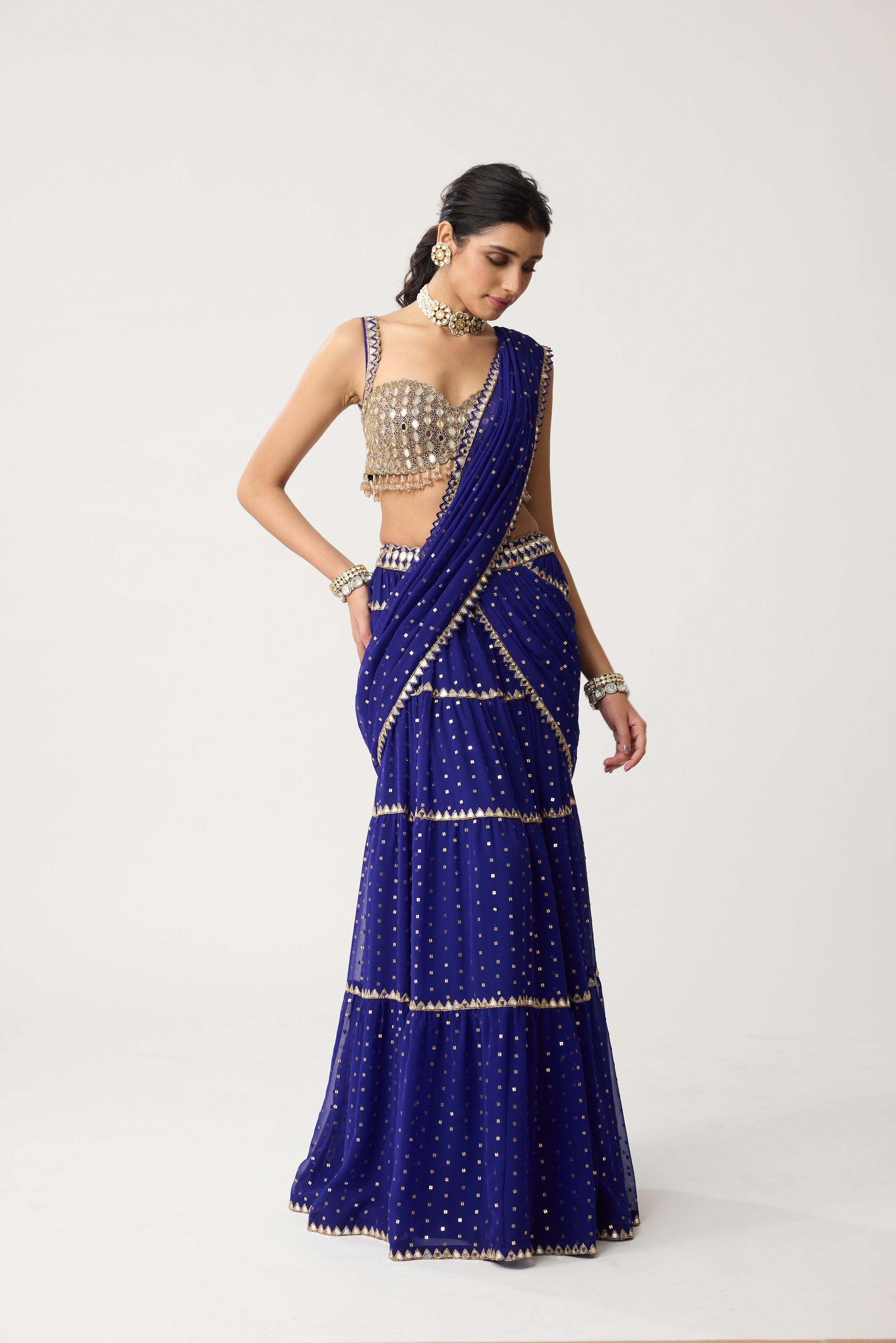 Persian Blue Multi-tier Mirror hand embroidered Georgette Saree clubbed with real hand cut mirror embroidered sleeveless blouse.
