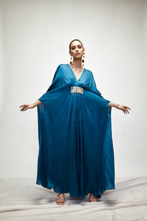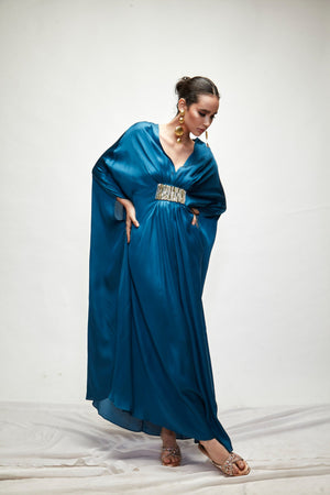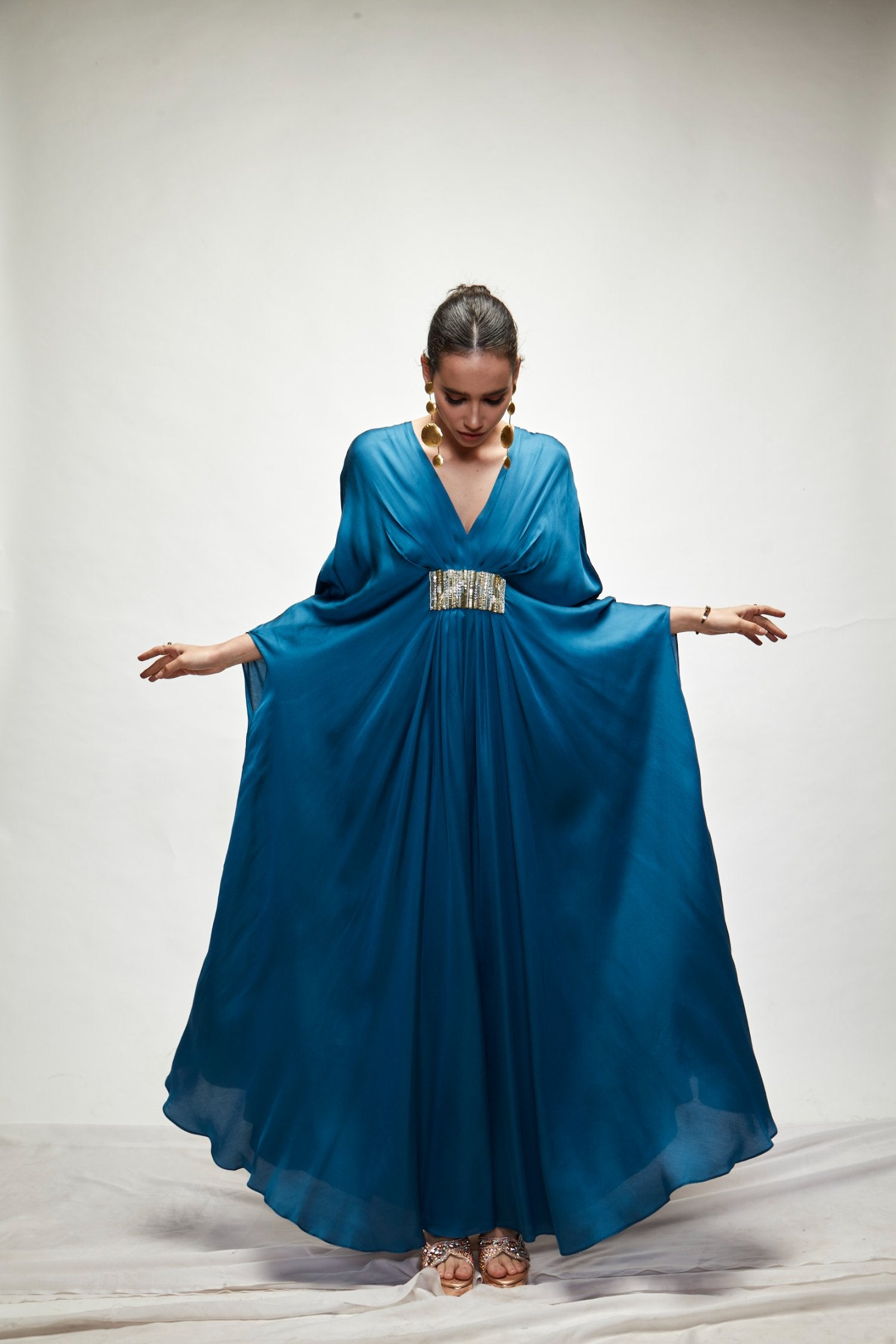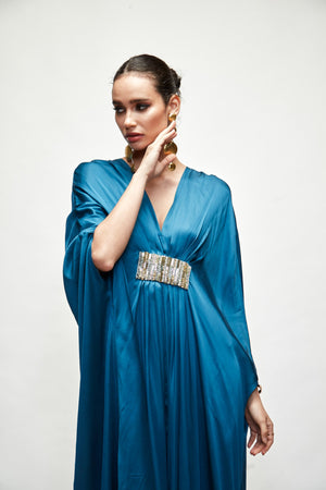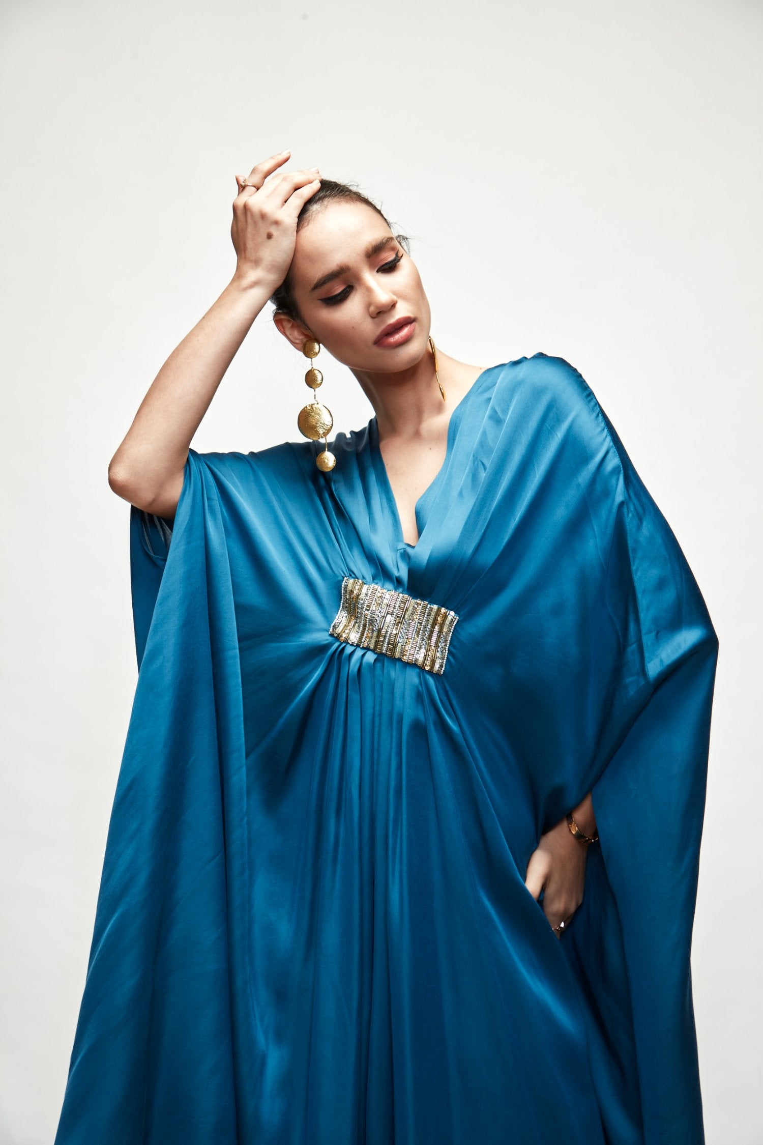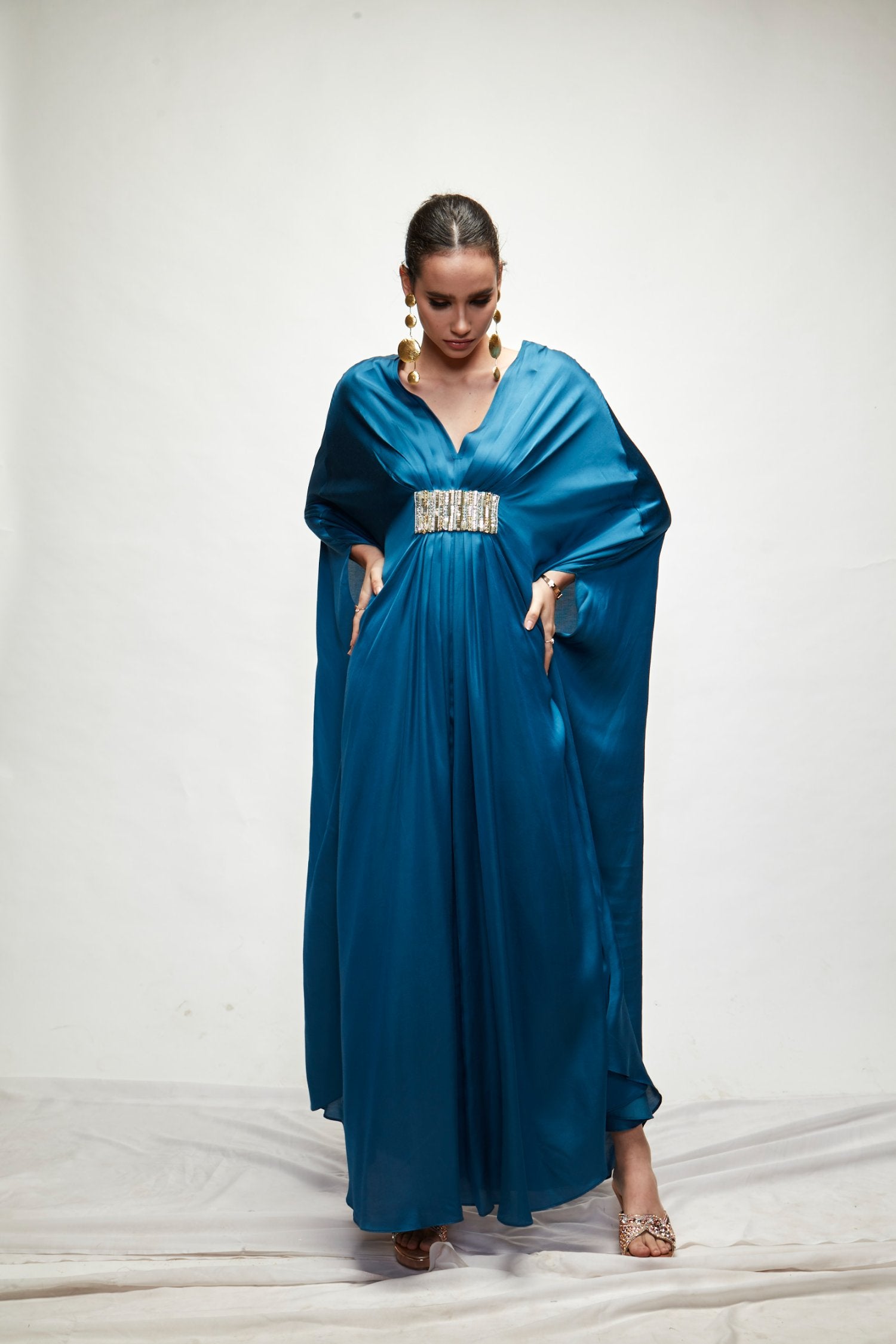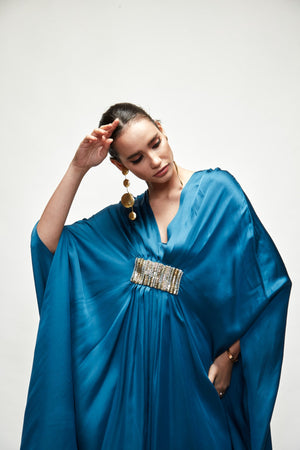 Silk Kaftaan With Front Pleate Detailing . Beaded Embroidery On Front